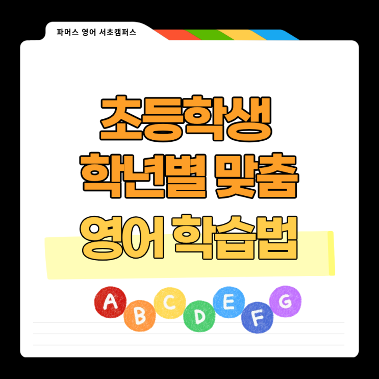 안녕하세요 파머스 영어 서초캠퍼스입니다 ~ ^^ 오늘은 초등학생 자녀 영어 학습에 대해 고민이 많으실 학부모님들을 위해 초등학교 1학년부터 곧 중학교에 입학할 6학년까지, 학년별 영어 학습 방법에 대해 정리해드리고자 합니다! 초등 1~2학년 초등학교 저학년 시기에는 영어에 대한 긍정적인 경험을 만드는 것이 가장 중요합니다! 영어 동화나 노래, 애니메이션 등으로 자연스럽게 영어를 접하게 하며 공부가 아닌 '익숙함'을 만들어주는 과정이 필요합니다. 이때 이미지를 활용해 학습하는 것이 효과적입니다. 그림과 사진을 통해 단어와 문장을 함께 익히면 아이들이 의미를 직관적으로 이해하고 오래 기억할 수 있습니다. 이와....... <img src="https://blogthumb.pstatic.net/MjAyNjA0MjJfMjA4/MDAxNzc2ODQ5NzE4NTEy.UzASepnKW3y_zmvozG1RXMU3f3dwRhCT266RtI-L6wMg.ZGfJMJfwJC051u7x0AzM7eaqiB8pJ-chK3jNfKoPsoMg.PNG/%C1%A6%B8%F1%C0%BB_%C0%D4%B7%C2%C7%D8%C1%D6%BC%BC%BF%E4..png?type=s3" />