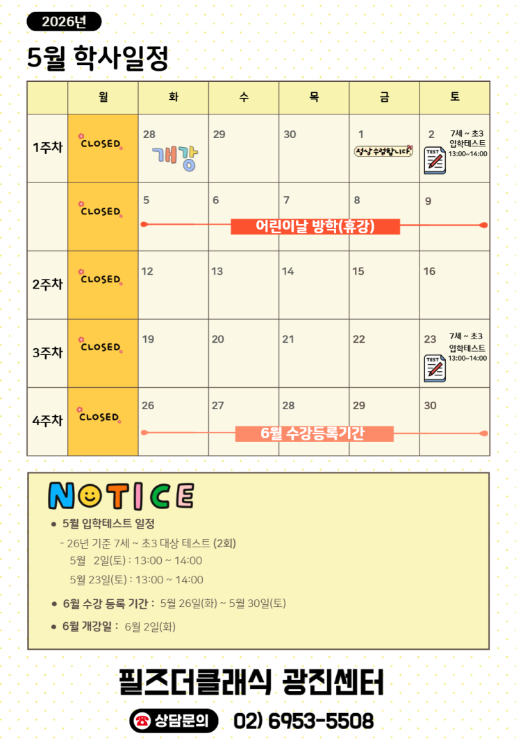 * 5월 입학테스트 일정 - 대상 : 7세 ~ 초3 (2026년 기준) - 날짜 및 시간 : 5월 2일 (토) 13 : 00 ~ 14 : 00 5월 23일 (토) 13 : 00 ~ 14 : 00 (입학테스트 신청은 필즈더클래식 홈페이지를 통해서만 가능합니다) <img src="https://blogthumb.pstatic.net/MjAyNjA0MjhfMjgy/MDAxNzc3MzYzNjI5MjMw.WBY8yOSrzvz5IqEZ8f19dJs7oImLr3ltBXjePGSA6sEg.uryUyOEvPZwnLy9jRCqbguB-CNChUBiyesGGf2K79ucg.PNG/KakaoTalk_Photo_2026-04-28-17-06-43.png?type=s3" />