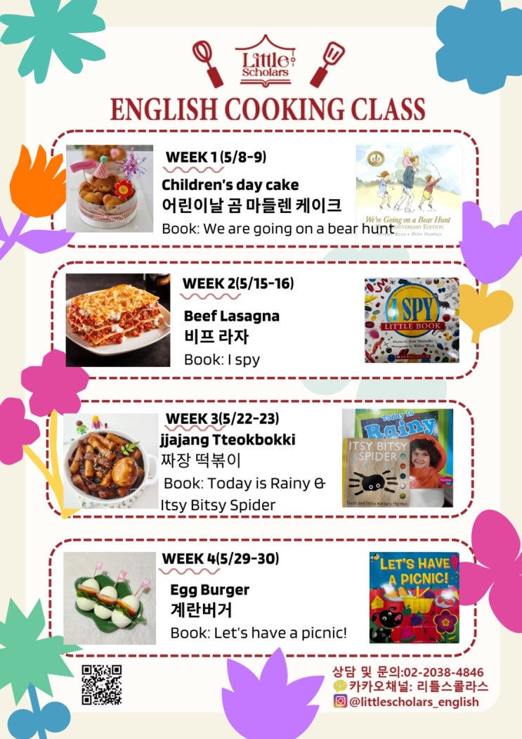 Little Scholars English Cooking Class 안내 금요일 5:00 토요일 11:00 수업 가능합니다 아이들이 즐겁게 요리 활동을 하며 자연스럽게 영어를 사용할 수 있도록 요리 + 영어 스토리 + 말하기 활동이 결합된 수업을 진행합니다 각 주차마다 책과 연계된 표현을 배우고, 요리 과정 속에서 실제로 말해보는 활동을 통해 자연스러운 영어 발화를 목표로 합니다. English Cooking Class Curriculum 1. Week 1 (5/8–9) * Menu: Children’s Day Cake (어린이날 곰 마들렌 케이크) * Book: We’re Going on a Bear Hunt 2. Week 2 (5/15–16) * Menu: Beef Lasagna (비프 라자냐) * Book: I Spy 3. Week 3 (5/22–23) * Menu: Jjajang ....... <img src="https://blogthumb.pstatic.net/MjAyNjA0MjhfMjY5/MDAxNzc3MzQ2NzA1NDY4.Dy4yKnfGXfID5sfzSHOdh35ndcCuO2b7rq9kmr3mfQYg.rcvnkZFHuZmN-PsUF3h784QfG-CmS7_NmaRL4QSG5k8g.JPEG/IMG%A3%DF4201.jpg?type=s3" />