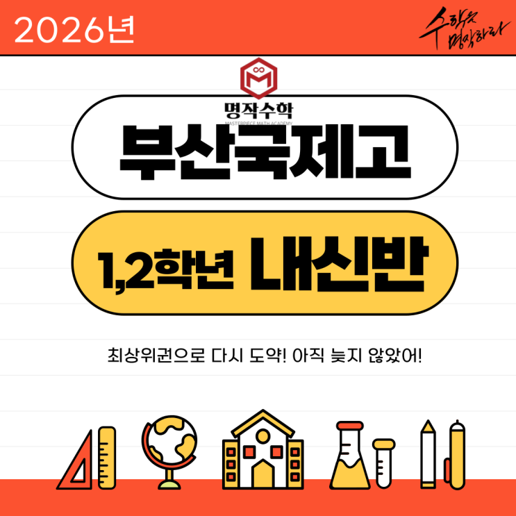 안녕하세요. 명작수학에서 부산국제고 내신담당을 맡고 있는 강수민T입니다. 2026학년도 강의 일정 및 수업 방식을 안내드립니다. 작년과 동일하게 온프라인 수업과 온라인 콘텐츠 제공을 통하여, 학생들의 학습 스타일과 상황에 맞춰 최적의 내신 대비가 가능하도록 수업을 준비했습니다. 1학기 기말고사 오프라인 수업 일정 수준별 2반 운영 ( 주 1회 3시간 수업 : 총 6주 구성 ) 토요일 수업반 : 5월 9일 개강 ~ 6월 20일 종강 ( 5월 23일 휴강, 6월 6일 정상수업 ) 일요일 수업반 : 5월 10일 개강 ~ 6월 21일 종강 ( 5월 24일 휴강, 6월 7일 정상수업 ) 해당 수업 요일 2시 ~ 4시 자율 클리닉 시행. 수업 형태 명작수학 부산국제고 내신대비....... <img src="https://blogthumb.pstatic.net/MjAyNjAzMDNfMjcg/MDAxNzcyNTE5OTYzNTQ3.pZVOagiSnaJ7XYN7AqcOSGIYeadpQs9k8ff-d1n12Dkg.hHUqcux6IGKWwBrQql_pvgJQU0h2TdfZKhWE2MjEx0Ig.PNG/26_%BA%CE%BB%EA%B1%B9%C1%A6%B0%ED_%B3%BB%BD%C5%B9%DD_%C7%A5%C1%F6.png?type=s3" />