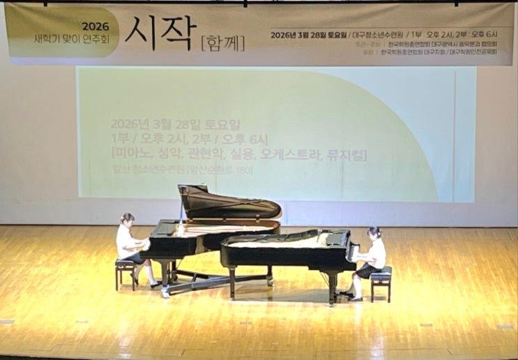 대구음악교육협의회 주최로 열린 "시작"연주회에 우리 <소리샘음악학원> 친구들이 참가해서 큰무대를 빛내✨️주었답니다. 기특하고 대견해~~~ 대구에 28개 학원을 대표하는 150여명의 학생들이 참가한 아주 큰 행사였어요 자랑스러운 우리 소리샘음악학원 친구들 화이팅! ✅️소리샘음악학원 https://www.instagram.com/sorisaem._.music?igsh=czEzbXllNGVvZmVm #소리샘음악학원 #용산동음악학원 #성지초 #이곡초 #성산초 #레슨 #유치부음악학원 #콩쿨 #용산동피아노학원 #피아노 #성지초피아노학원 #이곡동피아노학원 #예술융합특강 <img src="https://blogthumb.pstatic.net/MjAyNjA0MTJfNjgg/MDAxNzc2MDAxOTE0OTgw.jiOcv4l-McPNRUUUcOs_LY7ZI4z2E7sdb1m3fUS3yBsg.2Lr28HabvrghzTwSYzEdxgYvaPuP8m3xgwAiqkosVFkg.JPEG/900_1774699982081.jpg?type=s3" />