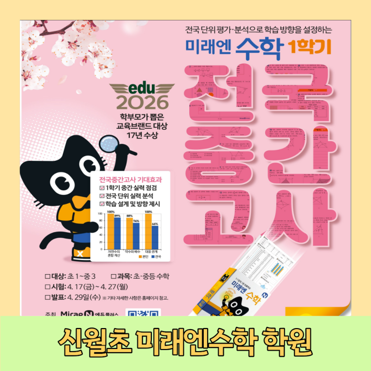 신월초수학학원 2026년 1학기 미래엔수학 전국중간고사 실시 (대천동수학.한샘초. 한솔초. 용천초 수학학원) 2026년 1학기 미래엔수학 전국중간고사 실시 (대천동 신월초 큐비학원) 안녕하세요, 신월초수학큐비입니다~~ 새 학기가 시작된 지금, 우리 아이의 학습 수준이 어느 정도인지, 혹시 놓치고 있는 빈틈은 없는지 궁금하시죠? 단순히 문제집만 많이 푸는 방식으로는 눈에 띄는 성과를 내기 어렵습니다. 아이의 현재 위치를 객관적으로 진단하고, 확실한 학습 전략을 세울 수 있는 2026년 1학기 미래엔수학 전국중간고사 실시 소식을 전해드립니다. 왜 '미래엔수학 전국중간고사'여야 할까요? 학교 시험만으로는 아이의 실력을 &#....... <img src="https://blogthumb.pstatic.net/MjAyNjA0MTdfMTQ5/MDAxNzc2NDAzMDI0Njcw.dQGgS3KIaIFu_tCaRqmthui5PPSIKW_ueYVMxRj25pUg.7GHnqji1Rhe6al2wtx4fkdfdAgaiHyj3U3WrQrIw2qwg.PNG/%C1%A6%B8%F1%C0%BB_%C0%D4%B7%C2%C7%D8%C1%D6%BC%BC%BF%E4._%281%29.png?type=s3" />