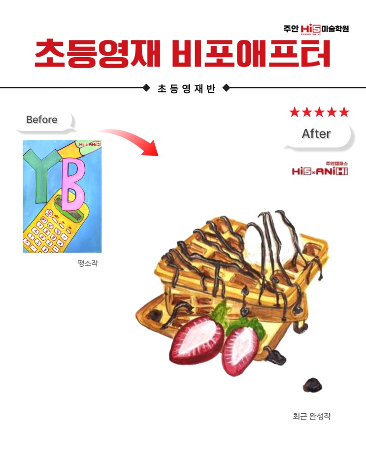 안녕하세요! 기존 브랜드에서 더 높은 교육 가치를 위해 Hi5(하이파이브)란 브랜드로 새롭게 시작하며 열리는 인천 미추홀구 미대입시 전문 미술학원 주안 Hi5(하이파이브) & AniHi(애니하이) 미술 학원 초등영재반입니다. 오늘은 초등 영재반의 비포&애프터 소식을 전해드립니다! 작은 변화들이 차곡차곡 쌓이며 자연스럽게 성장한 우리 영재의 기록을 보러가시죠! 짜잔~ 우리 영재의 자랑스러운 성장 기록! 과거 평소작은 선이 조심스럽고 표현이 단순했다면 최근 완성작은 훨씬 더 자신감있고 묘사 디테일로 완성해내고 있습니다 ㅎㅎ 평소 수업작에서도 점점 더 표현과 색감이 풍부해지고 화면을 채우는 힘이 성장하고 있어요 그....... <img src="https://blogthumb.pstatic.net/MjAyNjA0MTFfMzYg/MDAxNzc1ODY5OTYwMTg2.Xn9J3QQSKN7Uyu1_MGaTRHptiqGnaRAa58zPUNp26AYg.YFGGZNCgb7F8cENeBo39V4vzIzya32TJFwUE-AobmzYg.JPEG/25-%BF%A9%B8%A7%C6%AF%B0%AD-%BA%F1%C6%F7%BE%D6%C7%C1%C5%CD_%BA%B9%BB%E7%BA%BB-001.jpg?type=s3" />