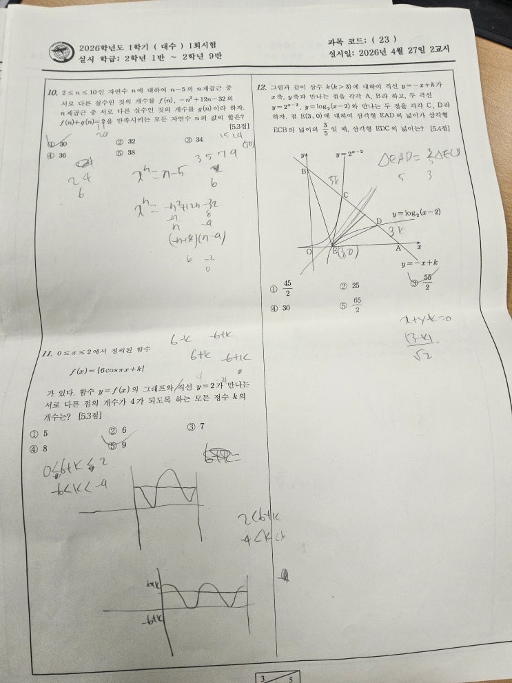 #시험범위[지수로그/삼각함수의 그래프] @주요 문제 특징@ 고난도 개념 결합 (10번, 12번): 거듭제곱근의 개수(지수)와 그래프의 교점(함수)을 결합하거나, 지수·로그함수의 역함수 관계 및 도형의 넓이 비를 활용하는 등 단원 간 통합 문제가 킬러 문항으로 출제되었습니다. 절댓값 및 삼각함수 변형 (11번, 단답형 6번): 단순한 삼각함수 계산을 넘어 절댓값이 포함된 함수의 그래프와 직선의 교점 개수를 묻는 등 그래프 추론 능력을 강조하고 있습니다. 논술형 변별력: 마지막 논술형 문제는 로그의 실생활 활용(경제 성장률)을 다루고 있어, 식 세우기부터 로그 연산까지 정확한 풀이 과정을 요구합니다. 2. 출제 경향 분석 변별력 있는 준....... <img src="https://blogthumb.pstatic.net/MjAyNjA0MzBfMTgz/MDAxNzc3NTUwMDc2Njg1.EAhnfA5XPT9tNt-jbBI8bgVstksdhn60xMXucu16Ilkg.KqHJZ0Es2tAhi46pAcWQUU9YQy2p2cCCWDJxNXyj6ZMg.JPEG/%BF%DC%B0%ED_%B0%ED2%BC%C9%C1%F62.jpg?type=s3" />