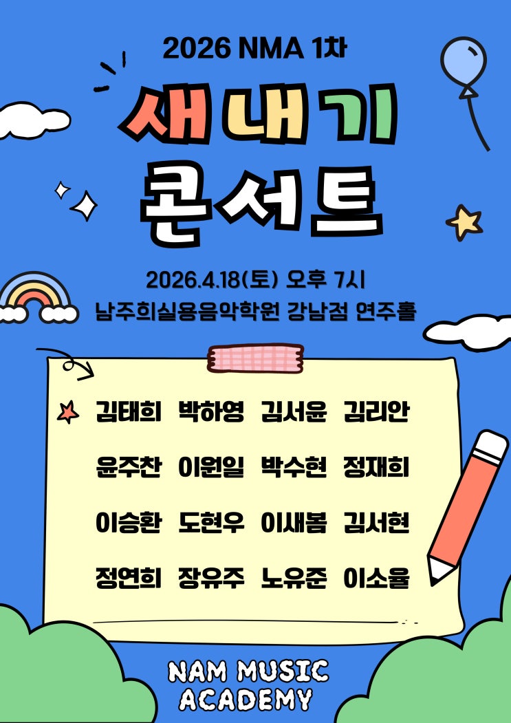 안녕하세요 남주희실용음악학원입니다 :) 벌써 새학기가 시작한 지 두달이 다 되어가는데 남뮤직은 신입생들의 발걸음이 끊이지 않는 활기찬 나날을 이어가고 있습니다. 그래서 오늘은 그중에서도 입학 후 단 한 번만 설 수 있는 특별한 무대 <새내기 콘서트>의 뒷이야기를 전해드리려 합니다. 따뜻한 봄기운이 가득한 4월 18일, 올해의 두번째 새내기콘서트가 성공적으로 막을 올렸습니다. 여기서 새내기 콘서트란? 남뮤직은 입시 전문 학원인 만큼 모의고사, 콩쿠르, 퍼포먼스 등 다양한 평가의 자리가 많습니다. 그중 새내기 콘서트는 신입생들의 무대 경험과 친목을 위한 행사입니다. 매년 4~5회씩 진행되고 있는데 이번에는 총 15명의....... <img src="https://blogthumb.pstatic.net/MjAyNjA0MDRfMTMz/MDAxNzc1Mjg2OTQ2NDE3.FkGckHFeZAGvcu6fWFrFnw1I3RWqQf8FZLi0t8bHOfYg.T1iRGRjNhLft40Y_nXjr4L52PhQQZ5Cfk7nBZe2h2zQg.JPEG/4%BF%F9-%BB%F5%B3%BB%B1%E2%C4%DC%BC%AD%C6%AE%28%B8%ED%B4%DC%29.jpg?type=s3" />