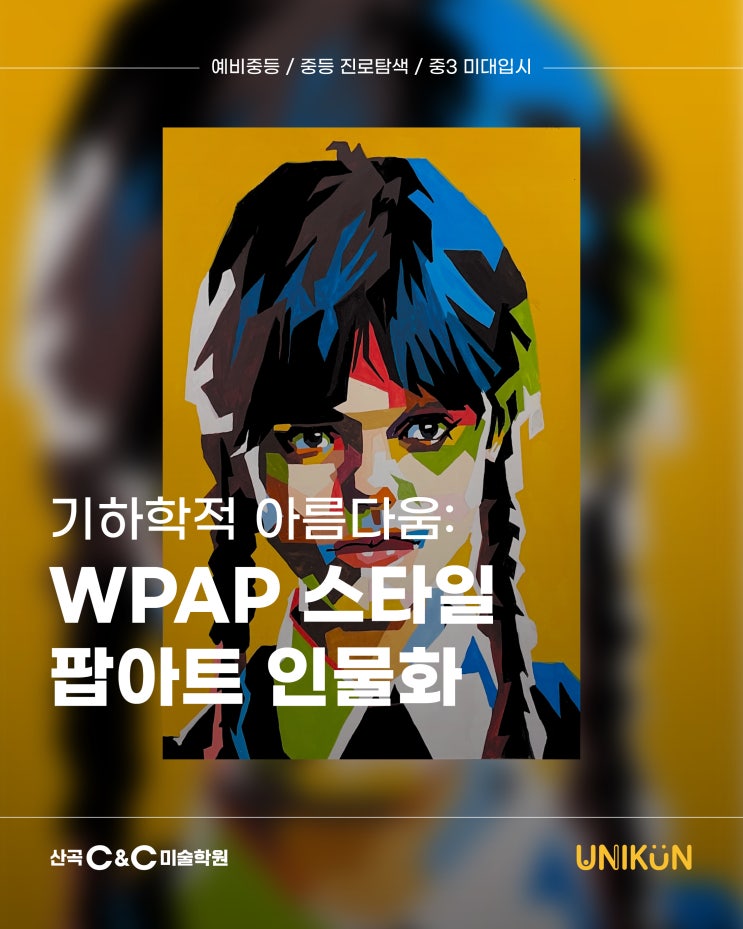 안녕하세요, 산곡 씨앤씨 미술학원의 진로탐색반 전임 승희T입니다~! 오늘은 우리 유니쿤 작가들이 오직 '직선'과 '면'만으로 인물의 생동감을 포착해낸 아주 특별한 프로젝트, WPAP 스타일 팝아트 수업의 결과물들을 소개해 드리려고 합니다. 하얀 도화지 위에 과감한 색채의 조각들을 채워 넣으며 자신만의 시각을 정립해 나간 우리 아이들의 열정적인 시간을 공유합니다~ 곡선 없이 그려내는 입체, WPAP 기법이란? 인도네시아의 예술가 웨다 압둘 라시드가 창안한 WPAP(Wedha‘s Pop Art Portrait) 기법으로 이 기법의 매력은 곡선을 전혀 사용하지 않고, 오직 직선과 기하학적인 면 분할만으로 대상을 재구성....... <img src="https://blogthumb.pstatic.net/MjAyNjA0MTVfNDAg/MDAxNzc2MjM5NDEyNTg0.tLveMAH1z2ktuD4lOYc-wMXQ0MllBAouC3BnDv5IDeYg.EIXSjEQwN7q1ZfKulV0C7iHu183vSgNivnIsRzRp6MQg.JPEG/%C6%CB%BE%C6%C6%AE-01.jpg?type=s3" />
