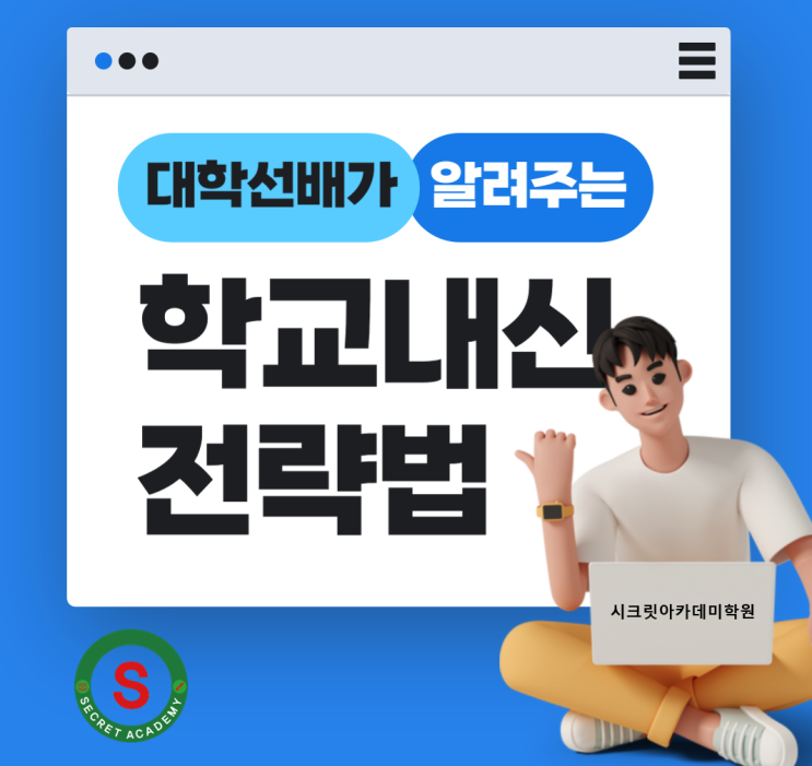 "내신 시험이 다가오는데, 어디서부터 어떻게 시작해야 할지 모르겠어요." 중고등학생이라면 누구나 한 번쯤 해본 고민이죠. 오늘은 여러분의 대학 선배들이 직접 전해주는 학교 내신 전략법을 과목별로 정리해 드릴게요. 내신 공부법이라고 해서 특별한 비법이 따로 있는 게 아니에요. 올바른 방향으로, 꾸준히, 체계적으로 준비하는 것이 전부랍니다. 동춘동 수학학원 시크릿아카데미학원에서 오랫동안 학생들을 지도하며 쌓아온 노하우와 실제 대학(명문 대학)에 합격한 선배들의 경험을 함께 담았어요. 끝까지 읽고 지금 당장 실천해 보세요! 내신 계획법 — 체계적인 준비가 좋은 점수를 만든다 내신 시험에서 점수를 올리고 싶다....... <img src="https://blogthumb.pstatic.net/MjAyNjA0MjBfNTIg/MDAxNzc2NjYwNzIyNTQx.-sx6n_6i8rN0PQDnVCIlpnzTiw1cYjdPSKsOWftT7PMg.XRdj6IxNF7a0QUJsqhRTN0hXR_LadA0KmRfyLslvAw8g.PNG/%3F%84%A0%EB%B0%3F-1.png?type=s3" />