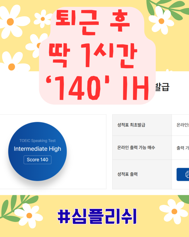안녕하세요. 울산성인 영어학원 심플리쉬입니다. 오늘은 짧지만 확실한 결과를 만든 수강생 이야기를 공유드릴게요. 지난달 토익스피킹 수업을 들었던 분인데, 130점 목표로 시작해 한 달 만에 140점을 달성했다는 연락을 받았습니다. 이 수강생은 이직 준비로 시간이 많지 않은 상황이었습니다. 그래서 처음부터 실전 중심, 단기 점수 전략으로 수업을 진행했어요. 심플리쉬에서는 수업뿐 아니라 학원 카페 모의고사를 통해 실제 시험처럼 반복 연습을 하도록 합니다. 토익스피킹은 결국 ‘말하기’이기 때문에 이 반복 훈련이 점수를 결정합니다. 이 학생이 인상 깊었던 건 ‘꾸준함’이었습니다. 회식 때문에 한 번 결석을 했지만, ✔ 수업 녹....... <img src="https://blogthumb.pstatic.net/MjAyNjA0MjNfMTY4/MDAxNzc2OTI2OTU2NTI1.7SI3t033dmyyXAlluQnWIqzEN4eKBddvaRwTblzL6Rgg.PD6WpWyiJNr2HFfIb8MlDL43LcU0Cu4c0dQox4Ex07og.PNG/3.png?type=s3" />