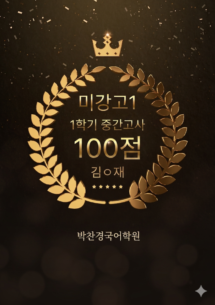 축하합니다! 김ㅇ재 100점. 이번 시험이 어려웠다는 평이 많은데도 100점을 받았습니다. 지난번 3모에서는 신ㅇ주 학생이 전교1등을 했었는데, 이번 중간고사에서는 김ㅇ재 학생이 100점으로 전교1등을 하게 되었군요. 저희 미강고반은 재원생의 80% 이상이 1등급 받을 것 같습니다. 확정되면 다시 알려드리겠습니다. <img src="https://blogthumb.pstatic.net/MjAyNjA0MzBfNTMg/MDAxNzc3NTIyMDY5MDcx.Pe5qMsdkf297IfaT9xikADXU2tvW38x9JGWnBxjEkCQg.emOp4njlrTg6NSnTYVbuj3M-NC_FfQ854IOEdCvA2CEg.PNG/1777522043663.png?type=s3" />