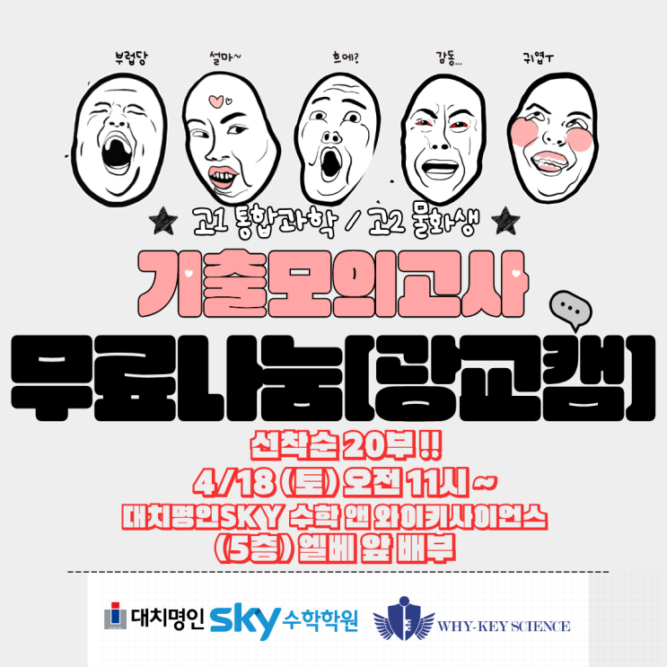 안녕하세요 대치명인스카이 수학 앤 와이키사이언스 학원입니다. 26학년도 1학기 1회고사 대비 잘 되어 가고 있으신지요? 재원생 여러분의 고득점을 위해 열심히 지도하고 있습니다. 과학 ! 중요한 과목입니다~~ 그래서 !! 혼자 공부하는 학생들의 시험을 응원하며~ 비재원생을 위한 적중모의고사 무료나눔 이벤트 ~!! 4/28 토요일 오전 11시~ 소진시까지 학년별로 20부 !!! [ 적중 모의고사 ] 고1 통합과학 고2 물,화,생 각 캠퍼스의 엘베 앞에 비치됩니다~~ 선착순 입니다!! 많은 관심 바랍니다. #와이키사이언스 #과학학원 #수지과학학원 #광교과학학원 #중간고사 #무료나눔 #이벤트 <img src="https://blogthumb.pstatic.net/MjAyNjA0MTZfMTQ2/MDAxNzc2MzQ2ODQ4OTc5.-JEOC8GKgcsDNkbI6lVdufMoa6ESqwNj1D8nUAA8cwsg.xarRu3JftAOTIhxTGkc0A0rrwjx59grciSuV-b5FWIMg.PNG/%B9%AB%B7%E1%B3%AA%B4%AE%C1%A4%BB%E7%B0%A2_%281%29.png?type=s3" />