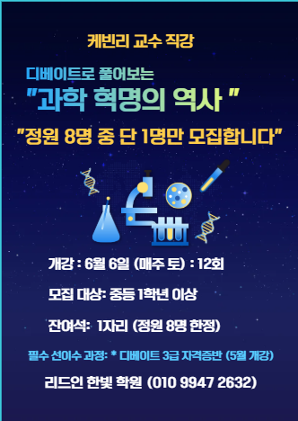 안녕하세요. 리드인 한빛학원입니다. 토론 교육의 권위자, 케빈리 교수님과 함께하는 <과학 혁명의 역사> 디베이트 특강이 오는 6월 드디어 개강합니다!사전 예약한 학생들이 등록하고, 이제 마지막 1자리만 남았습니다. 이번 과정은 단순한 토론 수업이 아니라, 과학혁명의 핵심 원전을 바탕으로 사고의 깊이를 확장하고, 디베이트를 통해 이를 자신의 언어로 정리하는 심화 과정입니다. Ⅰ. 과정 안내 개강일: 6월 6일(토) 수업 시간: 매주 토요일 오전 9시 ~ 오후 12시 총 12차시 진행 강의: 케빈리 교수 직강 정원: 8명 (소수 정예) → 현재 1자리 잔여 Ⅱ. 왜 ‘과학혁명’인가 이 과정은 베이컨, 갈릴레오, 뉴턴, 다윈부터 현대의 AI....... <img src="https://blogthumb.pstatic.net/MjAyNjA0MjBfNjMg/MDAxNzc2NjY5NjczODAz.XC-mW8m4riQ0Sy4vnsZA7Euh1U3ST_9j9SdclmLCfSMg.3gOcoUciGury7TBPDNcy4TGfST9atBpu8imkPJjbBoQg.PNG/image.png?type=s3" />