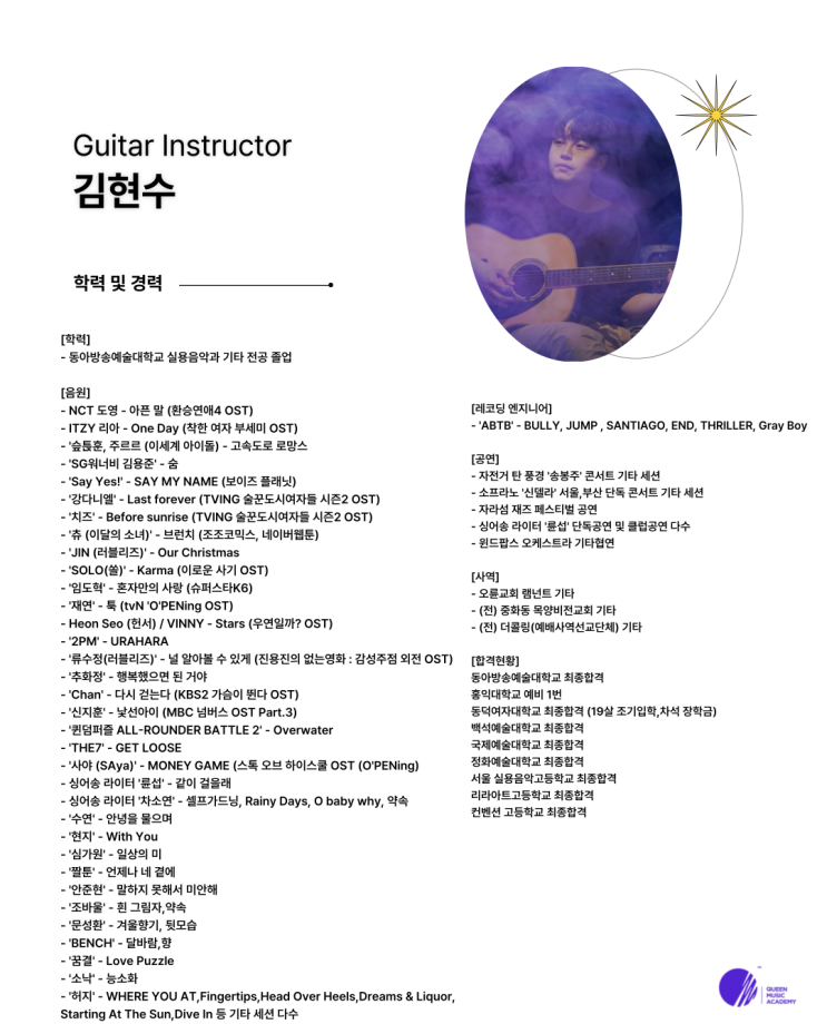 안녕하세요.!! 음악을 사랑하는 분들의 즐거운 놀이터 퀸실용음악학원 입니다!!! 악기 하나쯤은 제대로 다뤄보고 싶다는 생각, 다들 한 번쯤 해보셨을텐데요. 특히 '기타' 는 휴대성도 좋고 매력적인 음색 덕분에 꾸준히 인기가 많은 악기입니다. 하지만 독학으로 시작했다가 손가락만 아프고 포기하신 분들도 많으시죠?? 오늘은 왜 퀸실용음악학원에서 시작해요 '제대로' 배울 수 있는지, 저희 학원만의 특별한 장점을 소개해드릴게요.!! 실력파 강사 4인의 밀착 1:1 개인레슨 저희 학원에는 실력과 인품을 겸비한 네 분의 기타 전문 선생님이 계십니다. 단체 수업으로는 절대 채울 수 없는 디테일을 위해 모든 수업은 1:1 ....... <img src="https://blogthumb.pstatic.net/MjAyNjA0MjlfMjA5/MDAxNzc3NDUwMDI5MTIw.vW4Hm-GcrYgvWoQSMZfNkDYs1Q_R0miZ0WLorWPgcYgg.7GusZJbw8OwgYKhjjmHbNhYG8MkuHf4q9fPJVHnit7Ug.PNG/KakaoTalk_20260429_170425627_04.png?type=s3" />