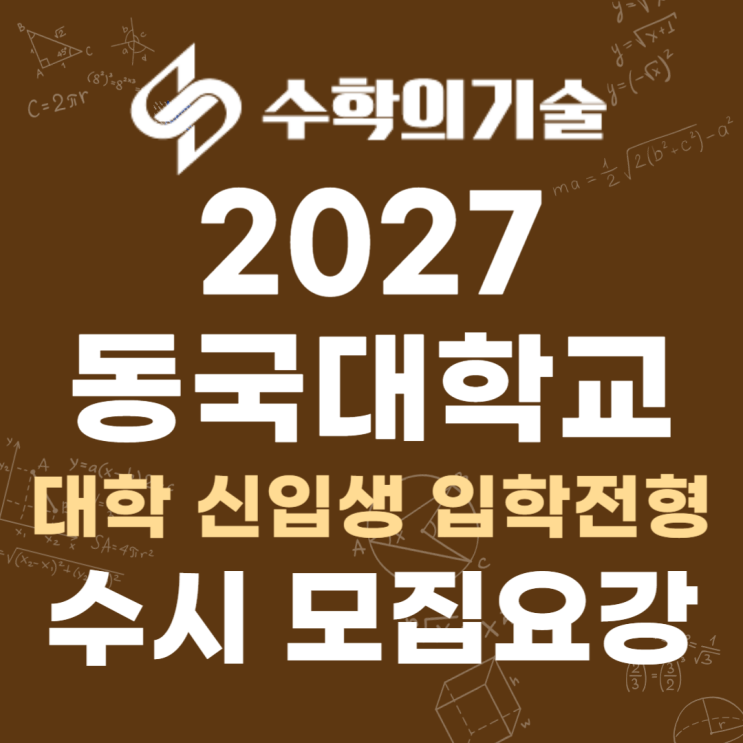 안녕하세요. 수학의기술학원입니다! 이번에는 2027 동국대 수시모집요강 대학입학전형시행계획을 요약해보겠습니다. 곧 5월이 다가오면 올해 입시 관련한 정식 모집요강이 공개될텐데 그때 꼭 달라진 정보가 있는지 확인 후 입시를 준비하시면 더 좋을 것 같습니다. 이번 글의 경우 수시를 중심으로 작성했는데 다음 글에서는 정시 관련으로 작성할 예정이니 궁금하심녀 같이 확인해주세요! 2027 동국대 수시 주요 변경사항 [첨단분야 선정에 따른 모집단위 신설 및 입학정원 증원] -모집단위 현황- -모집단위 신설에 따른 전형별 선발 계획- [모집단위 광역화(무전공) 선발 확대 : 경영대학] 2027 동국대 수시 수능최저학력기준 [논술위주/논술....... <img src="https://blogthumb.pstatic.net/MjAyNjA0MjVfMTQx/MDAxNzc3MTA1MzM1MTg2.pjsFGPCjNLGNc_KdTJZZQzo9l-ynezEj2JIzjfe9r0Yg.nOlgk71nGmxKGb67NK8Ta9VHMpawl78oPJ32PkZ1y7Ug.PNG/001.png?type=s3" />