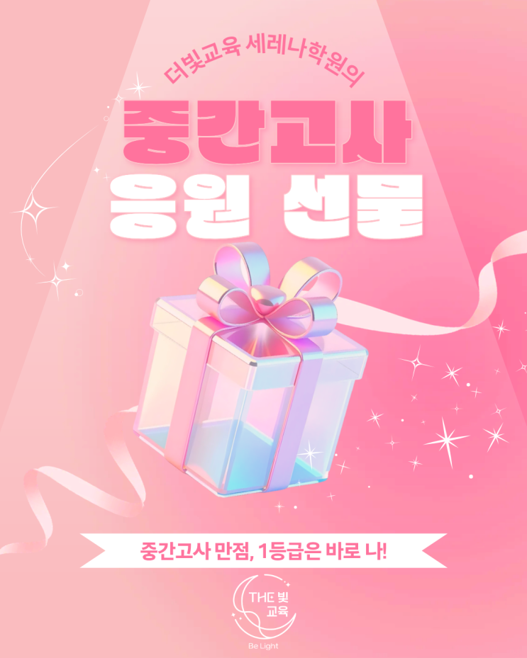 #더빛교육세레나학원 #중간고사 #내신 #100점 #1등급 #시험응원 안녕하세요~ 중고등학교 영어 수학 내신 대비 전문학원 강북구 미아동의 더빛교육 세레나학원입니다! 2026년 1학기 중간고사가 시작되었습니다. 그동안 열심히 공부하고 노력한 실력을 뽐낼 수 있는 시간이죠? :) 우리 학생들이 중간고사 내신 시험에서 긴장하지 않고 100점, 1등급 등의 좋은 결과를 받을 수 있도록 더빛교육 세레나학원에서 응원 선물을 준비했습니다! 중간고사 공부할 때 배도 고프고 졸리고 공부가 잘 안되면 스트레스도 받는 등 다양한 일이 생길 수 있는데 그럴 때 힘을 낼 수 있도록!! 다양한 간식을 담은 응원 선물을 만들었습니다! 개별 학생의 이름을 다....... <img src="https://blogthumb.pstatic.net/MjAyNjA0MjVfNjMg/MDAxNzc3MTA1NjEzODg1.BEfbumd5AZgzrxsJhgqD3uuVN4xBiYzvvi-Azy1yflYg.aqbaIW-cXbAMMn3TIimaBeeIQUDp_rHeqmOfizwQC10g.PNG/%C1%A6%B8%F1%C0%BB_%C0%D4%B7%C2%C7%D8%C1%D6%BC%BC%BF%E4..png?type=s3" />