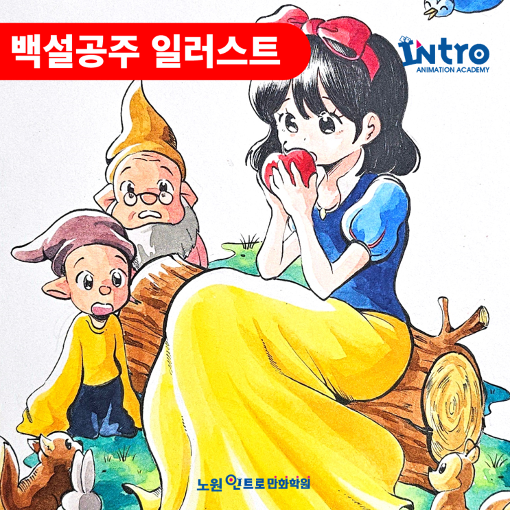 안녕하세요~ #마들애니학원 노원 인트로만화학원 입니다^^ 지난 포스팅에서는 BIAF 공모전 학생 참여작을 소개해 드렸는데요~! 오늘은 백설공주 일러스트를 그려보았습니다! 사과 개체를 응용하여 사과와 어울리는 대표적인 캐릭터인 백설공주를 그려보았어요 개체를 이해하고, 그릴 줄 알아야 이런 다양한 일러스트에도 잘 녹여낼 수 있답니다 자세한 단계별 설명과 함께 그림 살펴보시죠! [ 1단계 : 스케치 ] 1. 스케치 : 캐릭터 배치 및 크기 설정, 배경 구상, 타이포 디자인 단계 백설공주와 일곱 난쟁이들을 다 그리기보단 난쟁이 몇 명과 동물들 위주로 간단하게 구상해 봤어요! 또한 사과 개체가 잘 보일 수 있도록 백설공주....... <img src="https://blogthumb.pstatic.net/MjAyNjA0MjFfNjIg/MDAxNzc2NzUxODY5NzE1.UeXJzZqO1EBhri85mek7Z9qfZ4wYo1RUkJZT5jIzYJgg.OvdvUCmt-3dFwHrHOlHhghZmu4Z3U9ICTSYjA_-nJj0g.PNG/%B9%E9%BC%B3%B0%F8%C1%D6_%BD%E6%B3%D7%C0%CF.png?type=s3" />