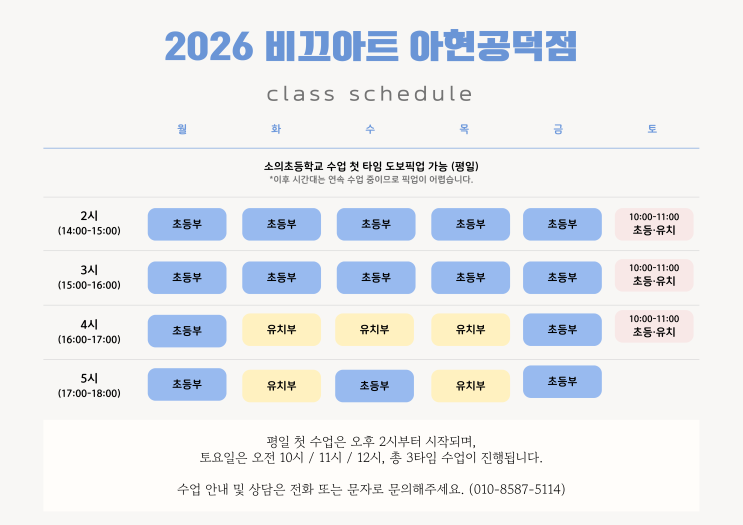 2026 비끄아트 아현공덕점 수업시간표 안내 | 소의초 픽업안내