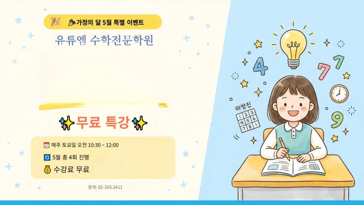안녕하세요. 유투엠 수학전문학원입니다. 가정의 달 5월을 맞아 초등 4학년 사고력 수학 무료 특강을 진행합니다 초등 4학년, 왜 중요한 시기일까요? 초등 4학년은 단순 계산 중심에서 벗어나 ✔️ 응용문제 ✔️ 서술형 문제 ✔️ 사고력 기반 문제 의 비중이 크게 늘어나는 시기입니다. 이 시기에 사고력의 기초를 제대로 잡아두지 않으면 이후 수학 학습에서 어려움을 겪기 쉽습니다. 유투엠 무료 특강 핵심 안내 ✔️ 대상: 초등 4학년 ✔️ 일정: 매주 토요일 오전 10:30 ~ 12:00 ✔️ 기간: 5월 한 달 (총 4회) ✔️ 수강료: 전액 무료 ✔️ 학습 자료: 제공 주차별 학습 프로그램 1주차 (5/9) 가로수와 통나무 → 간....... <img src="https://blogthumb.pstatic.net/MjAyNjA0MTNfMjEw/MDAxNzc2MDc1NjA5Nzgx.WeGWVJvYHLQjM44-evaVxsKLK5PfdcXejz4Jv7MYw-Yg.mI0xuY2mqDRk7IFXK-FMGOikJTy37GWmV5KeDqUrtTYg.JPEG/KakaoTalk_20260413_190316453.jpg?type=s3" />
