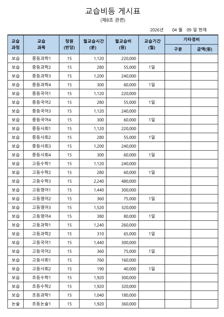 교습비등 게시표