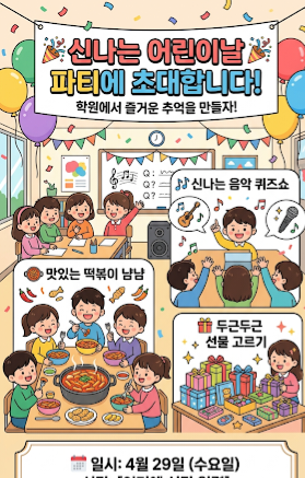 뮤직트리 피아노 어린이날 파티 안내 아이들이 기다리는 특별한 하루, 함께해요! 안녕하세요, 뮤직트리 피아노입니다! 다가오는 어린이날을 맞아 우리 아이들을 위한 즐거운 파티를 준비했어요! 일시 : 4월 29일 (수요일) 장소 : 뮤직트리 피아노 이번 파티에서는 아이들이 좋아하는 맛있는 떡볶이 먹기부터 ️ 재미있고 신나는 음악 퀴즈 풀기 그리고 기대되는 선물 고르기 시간 까지! 웃음과 즐거움이 가득한 시간을 보낼 예정입니다. 친구들과 함께 어울리며 음악도 즐기고, 좋은 추억을 만들 수 있는 시간인 만큼 우리 친구들 모두 빠짐없이 참석해주세요 아이들이 행복한 하루를 보낼 수 있도록 정성....... <img src="https://blogthumb.pstatic.net/MjAyNjA0MTZfMjY2/MDAxNzc2MzI1MTY1NDAw.XXnCiFc2nPAjGYNDhIGVs8tLT2u7jg2VblxjDXqyZXwg.zAJd6zCVCGLKUU4frcjEf-2z_NRSGjSM2gvu_F_63_Mg.PNG/1776155707593.png?type=s3" />