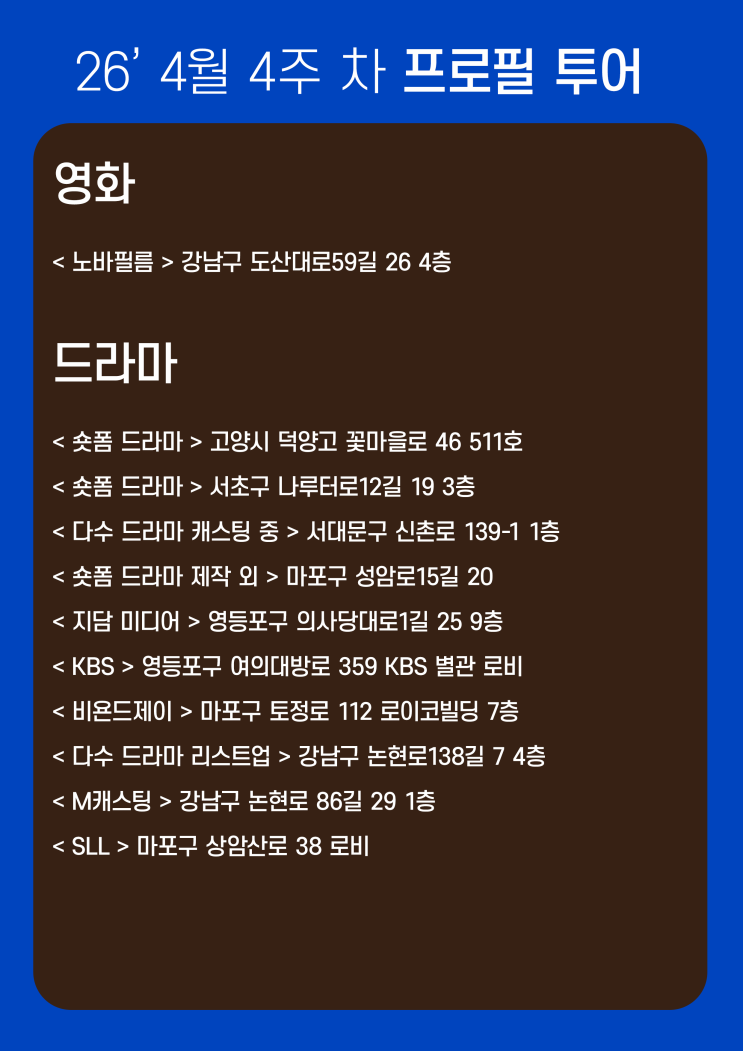 4월 4주 차 프로필 투어 영화 < 노바필름 > 강남구 도산대로59길 26 4층 드라마 < 숏폼 드라마 > 고양시 덕양고 꽃마을로 46 511호 < 숏폼 드라마 > 서초구 나루터로12길 19 3층 < 다수 드라마 캐스팅 중 > 서대문구 신촌로 139-1 1층 < 숏폼 드라마 제작 외 > 마포구 성암로15길 20 < 지담 미디어 > 영등포구 의사당대로1길 25 9층 < KBS > 영등포구 여의대방로 359 별관 로비 < 비욘드제이 > 마포구 토정로 112 로이코빌딩 7층 < 다수 드라마 리스트업 중 > 강남구 논현로138길 7 4층 < M캐스팅 > 강남구 논현로 86길 29 1층 < SLL > 마포구 상암산로 38 로비 주연 배우들....... <img src="https://blogthumb.pstatic.net/MjAyNjA0MjBfMTY3/MDAxNzc2NjQ4ODY3NTg3.soNu5JS4ZQKY4KiHLEYKigpomuFxWMxrt_OfM8yIOa8g.gR2Uzm8-Ym_2F55CjgNiGPuGcea9ivjZuYqUXxKmqnYg.PNG/%BF%B5%C8%AD.png?type=s3" />