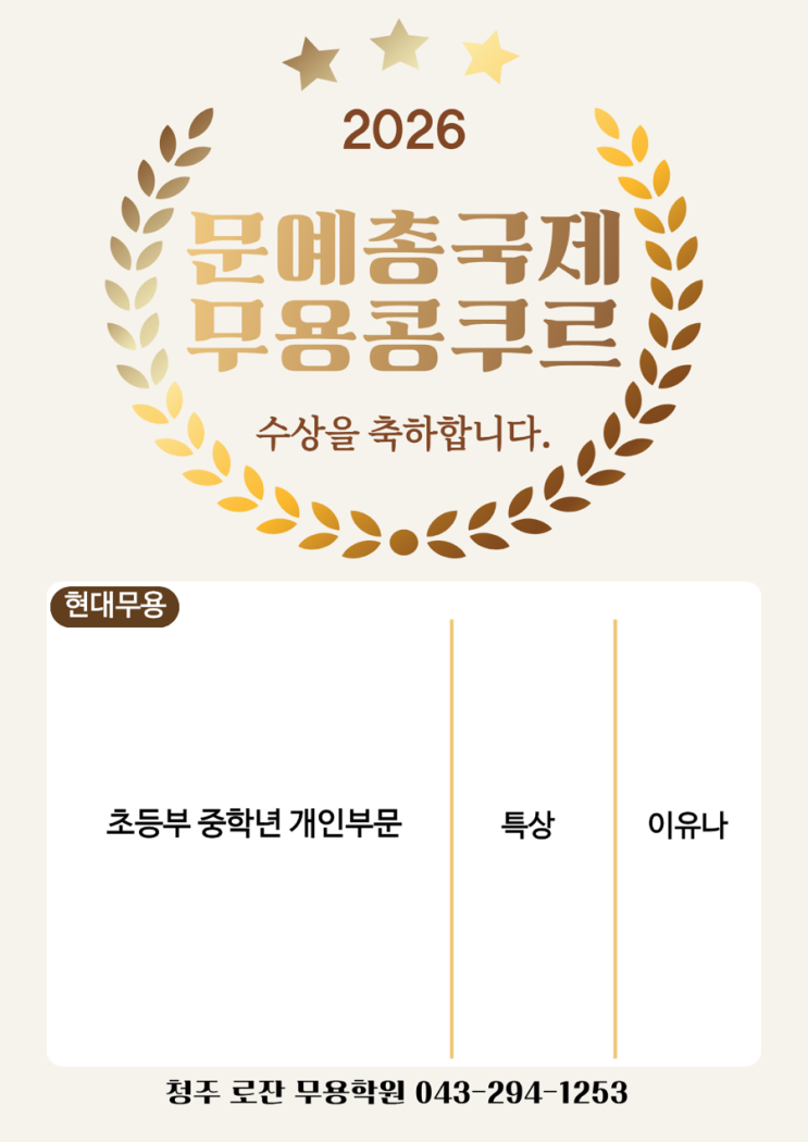 ✨ 2026 문예총 국제무용콩쿠르 ✨ 안녕하세요, 로잔무용학원입니다. 2026년 4월 4일 진행된 문예총 국제무용콩쿠르에서 로잔무용학원 전공반 이유나 학생이 우수한 성과를 거두었습니다 ✨ ⠀ 현대무용 초등부 중학년 창작 여자 개인부문 이유나 - 특상 ⠀ 이번 콩쿨은 두 번째 콩쿨로, 이전보다 한층 더 향상된 실력과 떨지 않고 안정감 있는 표현력을 보여준 무대였습니다. 이유나 학생에게 아낌없는 박수를 보내며, 앞으로 더욱 성장해 나갈 발걸음을 기대합니다 앞으로도 로잔무용학원은 학생 한 명 한 명의 가능성이 더욱 빛날 수 있도록 체계적인 지도와 진심 어린 교육으로 함께하겠습니다 청주시 서원구 분평동 122....... <img src="https://blogthumb.pstatic.net/MjAyNjA0MDhfMTc5/MDAxNzc1NjM5OTUzNDQw.I868b6Z0vniTHGF6t1wx6-2UXvquQAK31eD8UBtArSog.3AVXW8muEllpR0XT_e6FZN6xhL9cYnpEk1ZS01almmQg.PNG/%C1%A6%B8%F1%C0%BB_%C0%D4%B7%C2%C7%D8%C1%D6%BC%BC%BF%E4.%A3%AD9.png?type=s3" />