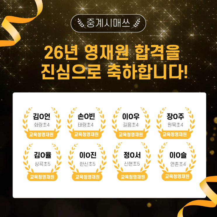 시매쓰 중계점에서 25년에 이어 26년에도 영재교육원을 준비한 아이들이 합격하였습니다. 특히 초등 5학년 아이들은 작년에 이어 올해도 연속으로 합격하는 놀라운 성과를 거뒀습니다. 이번에 합격한 아이들에게는 한 가지 공통된 학습 경로가 있어요. 짧은 기간에 만들어진 결과가 아니에요. 수년간의 꾸준한 과정이 쌓여서 만들어진 결과죠. 합격을 진심으로 축하합니다! 그동안 포기하지 않고 꾸준히 달려와 준 아이들, 그리고 옆에서 함께 응원해주신 부모님들께도 진심으로 감사드립니다. 합격은 끝이 아니라 더 넓은 세계로 나아가는 시작점이에요. 앞으로의 여정도 시매쓰 중계점이 함께하겠습니다 영재교육원 합격의 씨앗은 생각보....... <img src="https://blogthumb.pstatic.net/MjAyNjA0MjFfMzUg/MDAxNzc2NzUzMTI0Njg2._f0Pr0YxtJX_S0lYiMoHk3w4dtkLq1Jzv8noVcVxhAkg.Re3ijoQhBa31uEoZ6Jz_LdyixC-AygwGbswu0kxSc4Qg.PNG/%C1%DF%B0%E8%BF%B5%C0%E7%B1%B3%C0%B0%BF%F8.png?type=s3" />