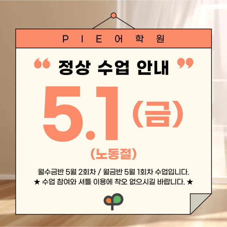 PIE어학원 5/1(금) 노동절 휴일 정상수업 안내