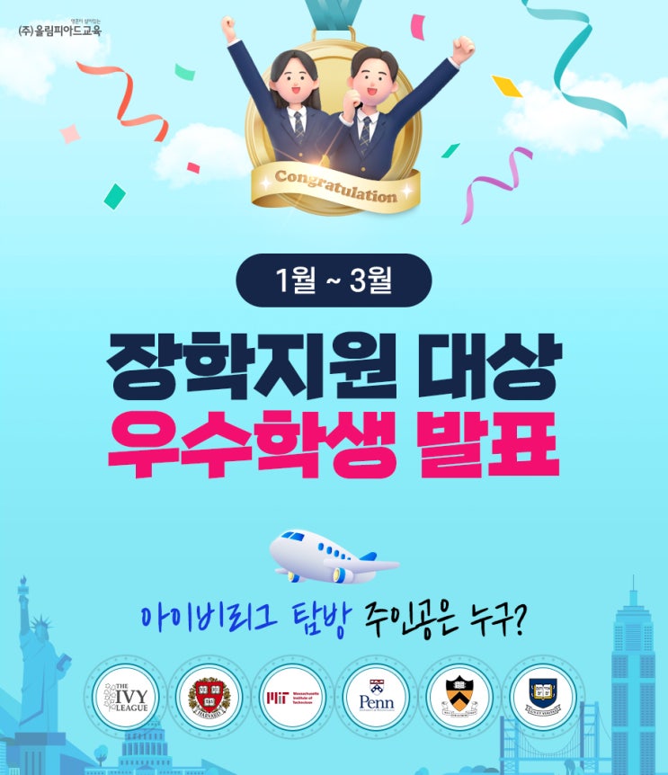 안녕하세요. 2026년의 시작과 함께 열심히 달려온 우리 학생들의 땀방울이 결실을 맺었습니다. 이번 1~3월 1분기 가장 빛나는 성과를 보여준 영광의 주인공은 누구일까요? 성실한 학습 태도와 노력으로 올림피아드교육 우수학생 장학지원 혜택의 주인공이 된 학생들을 소개합니다! ✈️ 아이비리그상 이*성 학생 (유투엠 고양삼송캠퍼스) 혜택: 아이비리그 10일 탐방권 (2027년 7월 여름방학 예정) 진심으로 축하드립니다! 세계적인 명문 대학을 직접 경험하며 더 큰 꿈을 품는 소중한 시간이 되길 바랍니다. 최우수상 아이비리그상 외에도 올림피아드학원, 유투엠, GLEC어학원에서 뛰어난 역량을 보여준 학생들이 최우수상에 선정되었습니....... <img src="https://blogthumb.pstatic.net/MjAyNjA0MjdfMTk5/MDAxNzc3MjYzMDc4Nzc3.Zn5HNDKiBK3xG8JipPh7PFk0WZE0EyLb2WAbWE3nkuYg.J7CPELb1GRUEFL730z2Pxw9MMpNuWxJwiiCyv-Vr0Cwg.JPEG/760b44b38bb542ea8ff39b54a54bb051.jpg?type=s3" />
