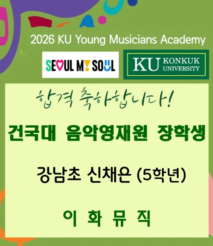 안녕하세요, 상도동 피아노 이화뮤직입니다. 작년 이맘때 전해드렸던 기쁜 소식을 올해에도 전해드리게 되었어요^^ 채은이가 건국대학교 음악영재원에 합격했습니다.^^ 채은이는 바른 터치와 기본기, 음악적인 감각을 함께 갖춘 아이예요. 손끝에서 만들어지는 소리를 귀로 듣고, 음악으로 이어가는 힘을 길러온 아이랍니다. 그렇게 쌓아온 시간들이 이번 결과로 이어지게 되었어요. 무대 위 한 번의 연주로 만들어진 결과가 아니라 그 뒤에 쌓여온 연습의 시간들과 집중의 순간들이 채은이를 이 자리까지 이끌었습니다. 그 과정을 알기에 저 또한 더욱 마음 깊이 축하하게 되네요. 이번에 준비한 모슈코프스키의 타란텔라는 빠르고 경쾌한 흐름....... <img src="https://blogthumb.pstatic.net/MjAyNjA0MThfMTgw/MDAxNzc2NTEzMzQyMzgx.qJ6N2Tt__-R1PnBA7Na42bLLqMBpS0vDFCqgPtlcGysg.l-Ffgw7k7zO5FAEg6-SsSSjvLSBO4_kaO473Lz9LgiMg.JPEG/900_1776347437415.jpg?type=s3" />