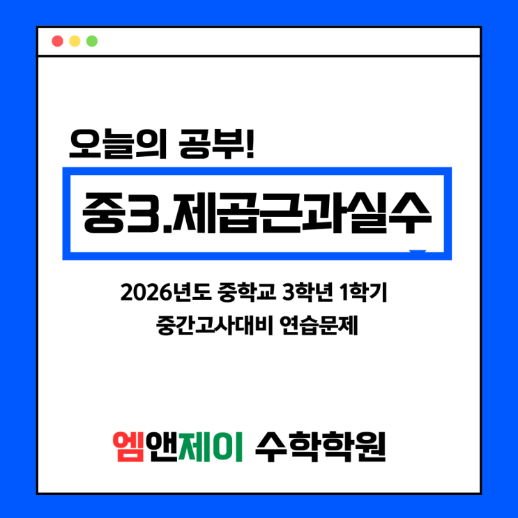 이제 중간고사가 일주일정도 앞으로 다가왔습니다~!! 그동안 열심히 공부했으니 좋은 결과 있길 바랍니다~^^ 시험 전에 나올만한 문제들을 골라보았으니 마지막까지 최선을 다해서 마무리하길 바랍니다~!! 2번은 제곱근의 성질을 이용한 대표적인 문제인데요~ 제곱근 완전제곱의 형태가 있을때는? 항상 절댓값과 함께여야 한다는 점~! 그래서 절댓값안에 있는 다항식의 부호에 따라서 결과가 달라지겠죠???^^ 3번과 4번은 무리수를 수직선위에 표현할수 있고, 무리수가 어떤 정수사이에 존재하는지 알아낼 수 있죠~^^ 또한 선분의 길이도 물어볼수 있겠죠? 5번과 6번은 실수의 크기를 비교하는 문제입니다. 5번과 같이 x에 수를 대입하여 크기를....... <img src="https://blogthumb.pstatic.net/MjAyNjA0MjBfMTUg/MDAxNzc2Njc0MzgzMzcx.ZyKBtdK6NjYncjTlLqnAshd9iyDCRFF83yhMdfZhmP8g.CbMm4i-PnNC3tDp_TQCMkWGoSDCLyiRCTdsqmBn5Ty0g.PNG/%BA%ED%B7%E7_%C8%AD%C0%CC%C6%AE_%BA%ED%B7%A2_%BD%C9%C7%C3_%C4%AB%B5%E5%B4%BA%BD%BA_%C5%D8%BD%BA%C6%AE_%C1%A4%BA%B8%BC%BA_%C0%CE%BD%BA%C5%B8%B1%D7%B7%A5_%C6%F7%BD%BA%C6%AE.png?type=s3" />