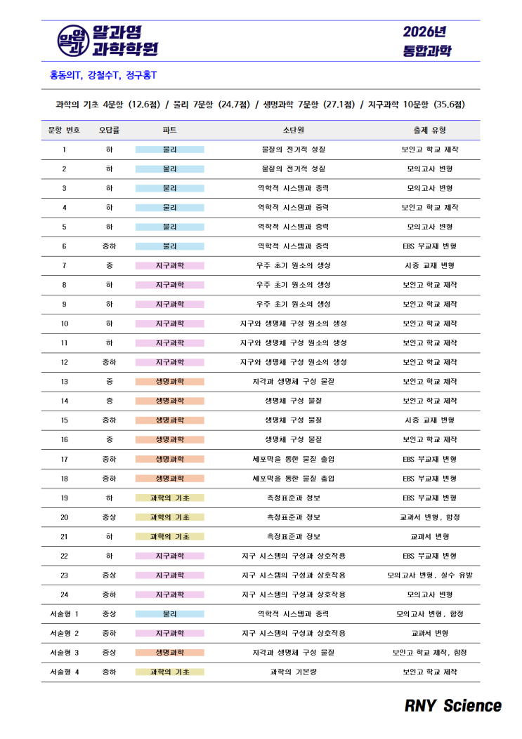 [알과영 송파관] 2026 보인고 1학년 통합과학 1학기 중간고사 기출 분석