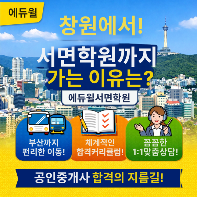 창원 공인중개사 수험생이 에듀윌 서면학원까지 오는 이유는? 창원에서 공인중개사 시험을 준비하는 수험생이 학원을 찾을 때 많은 분들이 먼저 검색하는 키워드가 바로 창원공인중개사학원입니다. 당연히 처음에는 가까운 창원 지역 안에서 학원을 찾게 되지만, 실제로 비교를 시작하면 생각보다 많은 분들이 부산까지 범위를 넓혀 알아보게 됩니다. 그 이유는 공인중개사 시험이 단순히 몇 주 다니고 끝나는 시험이 아니라, 오랜 시간 꾸준히 준비해야 하는 시험이기 때문입니다. 그래서 창원공인중개사학원을 찾는 분들 중에서도 수업과 상담, 학습 관리까지 함께 비교한 뒤 에듀윌 공인중개사 서면학원을 선택하는 경우가 생깁니다 ....... <img src="https://blogthumb.pstatic.net/MjAyNjA0MjFfNTgg/MDAxNzc2NzYxNDQ2Mzc5.-5451LtUw7PUxgnnpBUj61EK0rhXuYQ-3PshLsqZ5DYg.zL7Z8fuc0srDVxxwOlRZ4JClRTGk8D3-sg3sv1Wvj7gg.PNG/20260421_175015.png?type=s3" />