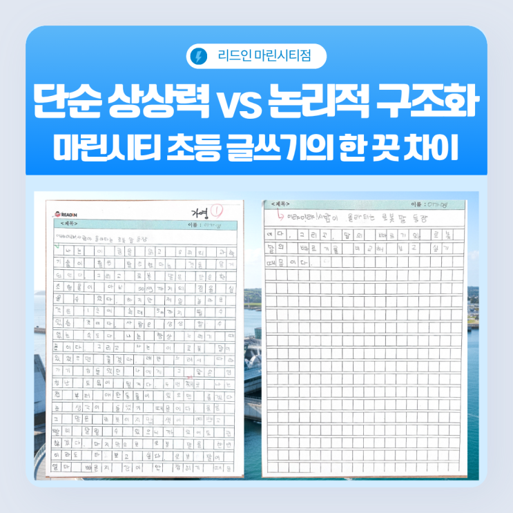 안녕하세요. 해운대 마린시티의 교육 깊이를 더하는 프리미엄 독서 테라피, 리드인 마린시티점입니다. 초등 고학년 학부모님들께서는 이제 아이의 글을 보실 때 단순히 '상상력'만을 체크하지 않으실 겁니다. "얼마나 논리적인가?", "자신의 주장에 대한 합리적 근거를 제시하는가?" 그리고 "추상적인 개념을 구체적인 어휘로 표현해내는가?"를 보게 되시죠. 중등 수행평가와 직결되는 '비판적 사고력'의 완성 단계이기 때문입니다. 오늘 리드인 마린시티점에서는 이번 과학의 날을 맞아 우리 고학년 아이들이 작성한 원고지 쓰기 결과물을 분석하며, 마린시티 상위 1% 아이들의 사고가....... <img src="https://blogthumb.pstatic.net/MjAyNjA0MjBfMTAz/MDAxNzc2NjU0OTI0MDQy.av1QCyZQ4CBjqlTtphzwnC0srA3e3tmyYqhi4tOCOzIg.JHQoD0N3leIWWaKld_Wf3E3L0qyftluMxbTrPC9mo3gg.PNG/2.png?type=s3" />