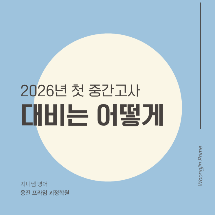 중간고사가 슬슬 시작되는 4월입니다 일요일 보강을 마치고 작성하는 웅진프라임 괴정학원 지니쌤의 영어 대비!!! 함께 가보실게용 1학기는 중학교 2학년과 3학년 고등부 전체가 시험을 치르는 학기입니다 중학교 1학년은 자유학기제로 아직 기초를 탄탄하게 다질 시기~ 그리고 올해 중학교 2학년과 고등학교 2학년은 22개정 교육과정이 처음 적용되는 해로 교과서가 달라졌답니다 하지만~ 교과서 출판사가 달라져도 교과서 구성이 바뀌어도 지니쌤과 함께면 문제 없음 먼저 중등부 대비 정리부터 보실게요 웅진프라임 괴정학원의 중등부 영어 내신 과정은 위와 같습니다 첫번째, 교과서 평가문제집을 바탕으로 꼼꼼한 내용정리 시중교재를 이용....... <img src="https://blogthumb.pstatic.net/MjAyNjA0MTlfMTA1/MDAxNzc2NTkyMDk1OTAy.Jef_Ja0k_61ov0JKUuPwRJ6YaCqLe01unfYTI9fwzgsg.YNhOG-VUGQxUS6mVSYl5CIzYlodxQB2ny9UpTuE37FMg.PNG/%BD%E6%B3%D7%C0%CF.png?type=s3" />