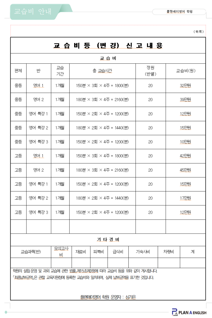 [안내] 플랜에이영어학원 교습비