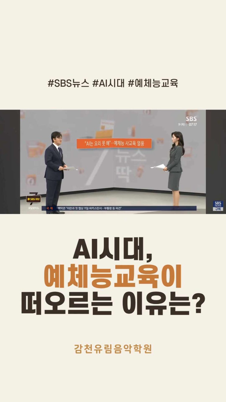 AI 시대, 국영수 중심에서 예체능으로 이동하는 이유는 무엇일까요? 초등학생 피아노 음악교육이 집중력과 창의력, 자기표현력을 키워주는 이유를 알려드립니다. ❗️요즘 사교육의 흐름이 바뀌고 있습니다. 국•영•수 중심에서 ▶️ 예체능, 창의·표현 영역으로 이동하고 있습니다. 그 이유는 단 하나입니다. ✅️ “AI가 대신할 수 없는 능력” 이제 중요한 것은 단순히 정답을 맞히는 아이가 아니라 ✔️ 스스로 생각하고 ✔️ 표현하고 ✔️ 만들어낼 수 있는 아이입니다. ⠀⠀ ⠀⠀ 그렇다면 이 힘은 어디서 길러질까요? 바로 음악교육입니다. ⠀⠀ ⠀⠀ 음악은 단순한 취미가 아니라 ✔️ 집중력 ✔️ 창의력 ✔️ 자기표현력 ✔️ 끝....... <img src="https://phinf.pstatic.net/image.nmv/blog_2026_04_13_2608/KPP0PiCzqH_03.jpg?type=f480x480" />