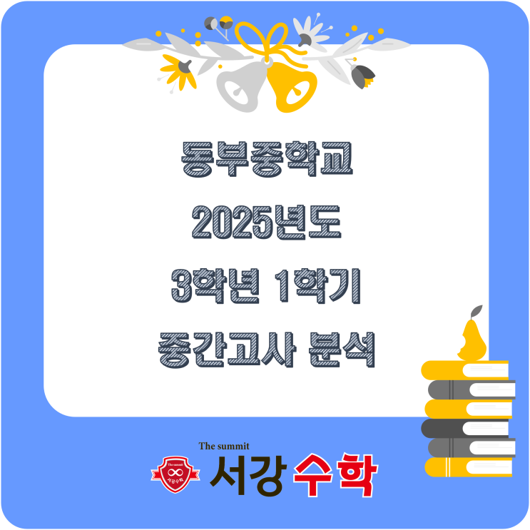 안녕하세요~! 대구 수성구 만촌동에 위치한 서강수학학원입니다~ 이번 동부중 중간고사는 4/29(수), 4/30(목) 이틀간 진행됩니다 남은 일주일 마무리 잘 해서 좋은 결과 얻길 바라요~ 동부중 3학년 수학 시험은 30일(목)에 실시됩니다~ 이 포스팅이 우리 동부중 3학년 학생들이 시험 대비하는 데 도움이 되길 바라면서 오늘은 동부중 2025년 3학년 1학기 중간고사를 분석해 보려 합니다~ [ 대구 동부중학교 2025년 3학년 1학기 중간고사 수학시험 분석 ] <시험 범위> 1-1 제곱근과 실수 1-2 근호를 포함한 식의 계산 2-1 다항식의 곱셈 2-2 인수분해 . . 객관식 60% + 서술형 40% 총 22문항으로 객관식 16문항, 서술형 6문항으로 구성되었....... <img src="https://blogthumb.pstatic.net/MjAyNjA0MjNfNiAg/MDAxNzc2OTM5MzI5OTM1.O0cfR3WGvWCofNlm_wNpmOiFiKQTTh4rl1h4-XLnNDcg.w82le6akfLPAFTCc8sf3CFWB6hzoAaBejrdLo2cYFp0g.PNG/%B5%BF%BA%CE%C1%DF.png?type=s3" />