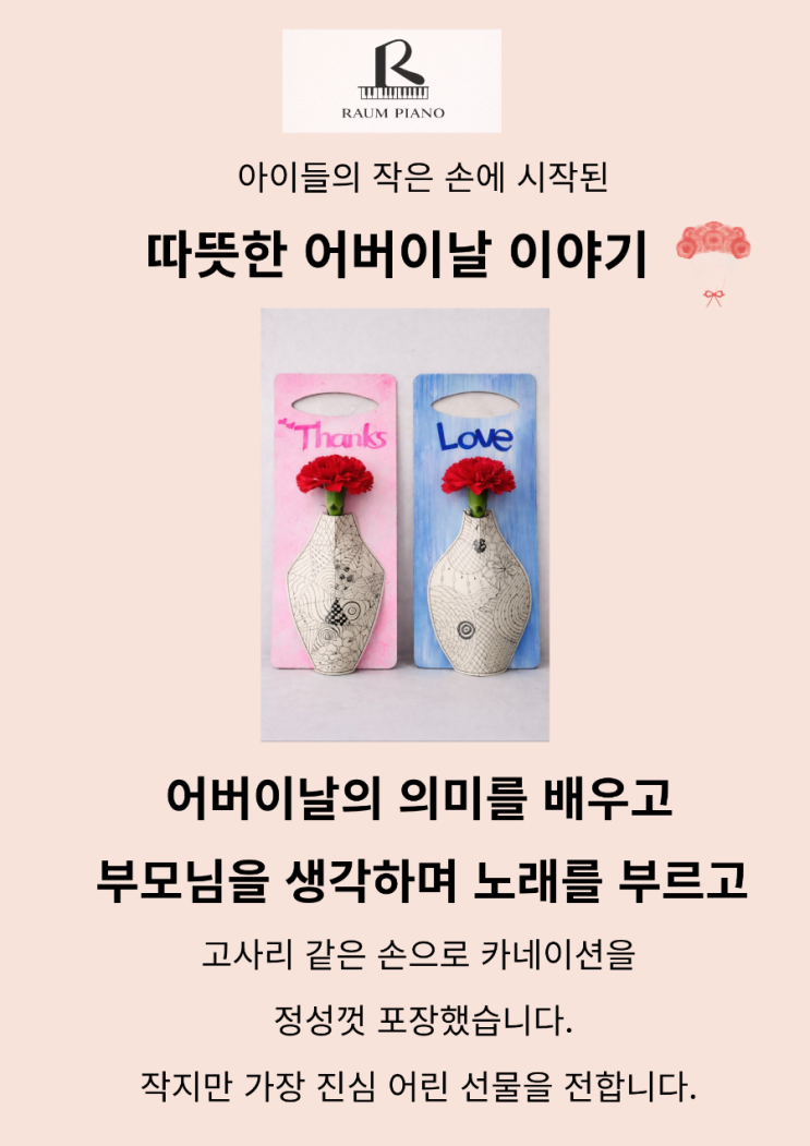 안녕하세요. 라움쌤 입니다. 라움 피아노는 5월 8일 어버이날을 맞아 아이들이 ‘감사’라는 감정을 배우고 표현하는 감정 수업을 준비했습니다. 이번 수업에서는 어버이날이 왜 생겨났는지 그 의미를 배우고, 부모님을 떠올리며 감사와 사랑의 마음을 느껴보는 시간을 가질 예정입니다. 아이들은 노래를 배우고, 부모님께 전할 짧은 영상편지를 직접 만들어보며 자신의 마음을 표현해볼 예정입니다. 또한 작은 손으로 카네이션을 정성껏 만들며 “고맙습니다”, “사랑합니다”라는 마음을 담아 부모님께 전하는 시간을 준비하고 있습니다. 요즘은 AI 시대입니다. 세상은 점점 더 편리해지고 많은 것을 대신해주는 시대가 되었습니다. 하지만 한....... <img src="https://blogthumb.pstatic.net/MjAyNjA0MjNfNDkg/MDAxNzc2OTI2Nzg0Mjg0.tCSJsS8H-ZReLqH_fxYKbQCCweqo7Pmpx6rB8GsjKjMg.uZGR2dnKHn0VBYr0vCueRlIJLJ7gAqBg-AcbGlG67gUg.PNG/900_%BA%CE%C1%A6%B8%F1_%C3%DF%B0%A1_20260420_160947_0000.png?type=s3" />