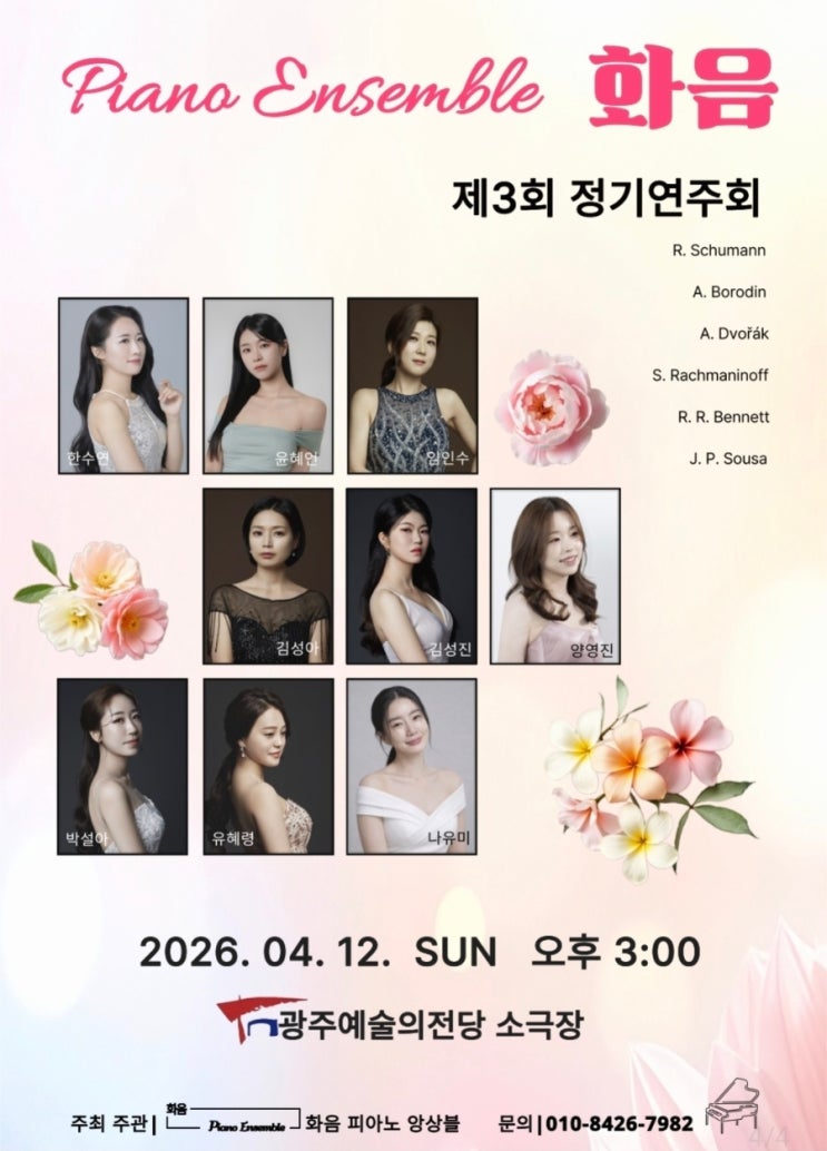 #선생님연주기록✨️ 2026. 04. 12 (일) 광주예술의전당 소극장 아이들 대회와 원내연주회(하우스콘서트)를 마치고 다음 날 이어진 나의 연주… 쉴 틈 없는 4월,,, 없는 시간을 쪼개 준비한 무대라 어떤 정신으로 해냈는지도 모를 만큼 정신없었지만, 끝까지 함께 호흡 맞춰주고 이해와 배려를 아끼지 않아준 나의 파트너에게 감사하며 좋은 공연으로 이끌어주신 대표님께도 감사드립니다. 이번 무대도 무사히, 완료! ✨ #신창동피아노학원 #신창동아인피아노음악학원 #화음정기연주회 #라흐마니노프_투피아노_모음곡_타란텔라..✨️ <img src="https://blogthumb.pstatic.net/MjAyNjA0MTdfMjE5/MDAxNzc2NDI0ODM5MzI2.lSJpuS6j64nSq513s3oBqn08rmE7WRudmjszDMFUV3sg.4sHQrXhNvG5Y3dq4tgmhEmHvVtn9P64dqfYLdlfyg2sg.JPEG/900_1776420724432.jpg?type=s3" />