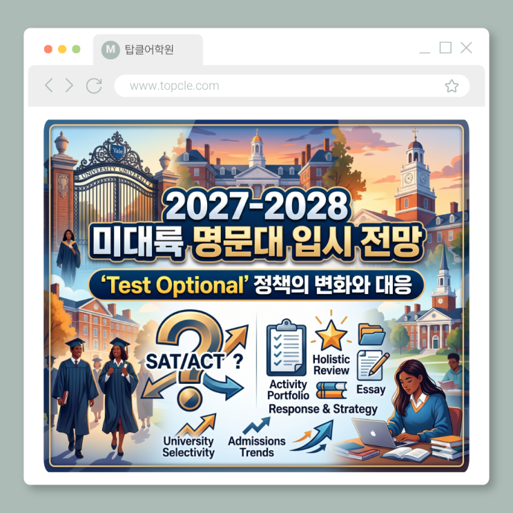 안녕하세요 최상의 결과를 만들어내는 탑클어학원입니다. 미국 대학 입시 시장이 거대한 변곡점을 맞이하고 있습니다. 지난 몇 년간 코로나19 팬데믹의 여파로 임시 도입되었던 'Test Optional(SAT/ACT 점수 제출 선택)' 정책이 빠르게 막을 내리고, 다시 'Test Required(점수 제출 의무화)'로 회귀하는 추세가 뚜렷해지고 있습니다. 이는 2027학년도와 2028학년도 입시를 준비하는 현재의 중고등학생들에게 매우 중요한 신호입니다. 대학들이 왜 다시 점수를 요구하기 시작했는지, 그리고 이러한 환경 변화 속에서 우리는 어떤 전략을 세워야 하는지 심도 있게 분석해 보겠습니다. 주요 대학의 점수 제출 의무화(Test-....... <img src="https://blogthumb.pstatic.net/MjAyNjA0MjdfMTQw/MDAxNzc3MjczMzc5Mjg4.GQJMKpE-xsuwZhq31L1jfno_k7uIjXcIBVv-sR2sNKsg.spB79cpzsUeQtkwXaBK4W3AksZY4I0h3hQm7mHOND20g.PNG/%C1%A6%B8%F1%C0%BB_%C0%D4%B7%C2%C7%D8%C1%D6%BC%BC%BF%E4._%2815%29.png?type=s3" />