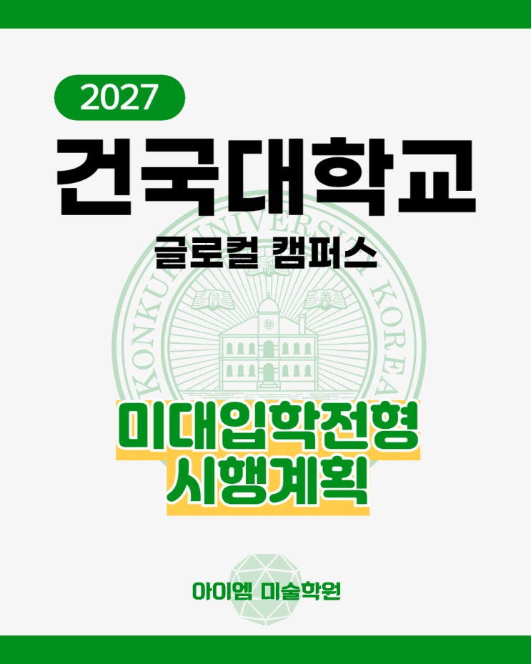 안녕하세요 아이엠미술학원입니다! 요즘 날씨가 정말 좋아졌죠! 밖에 나가기만 해도 기분이 한층 밝아지는 것 같습니다. 이렇게 날씨가 좋은 날에는 괜히 하루도 더 활기차게 보내고 싶어지는데요. 오늘은 2027학년도 건국대학교 글로컬캠퍼스 미대입학전형 시행계획을 준비했습니다! 주요 변경사항, 전형별 모집인원 2027년도 건국대 글로컬 주요 변경사항은 산업디자인 학과, 실내디자인 학과, 패션디자인학과는 사고의 전환 폐지입니다. 조형예술학과는 정물수묵담채화가 폐지되었고, 만화가 추가되었습니다. 수시 전형별 세부사항 2027학년도 건국대학교 수시 실기 전형별 세부사항입니다. 대학수학능력시험 최저학력기준 미적용입니다. 모집....... <img src="https://blogthumb.pstatic.net/MjAyNjA0MjJfNCAg/MDAxNzc2ODQwNDY5MDUz.73KtosWgPFTC6TLFQS_LGM62zvYCM47IK3Ty02bLLCgg.uFSnG_6jlwMbmEV94WKRipv6b0mtJRG8d_suLlwdAWAg.JPEG/003.jpg?type=s3" />