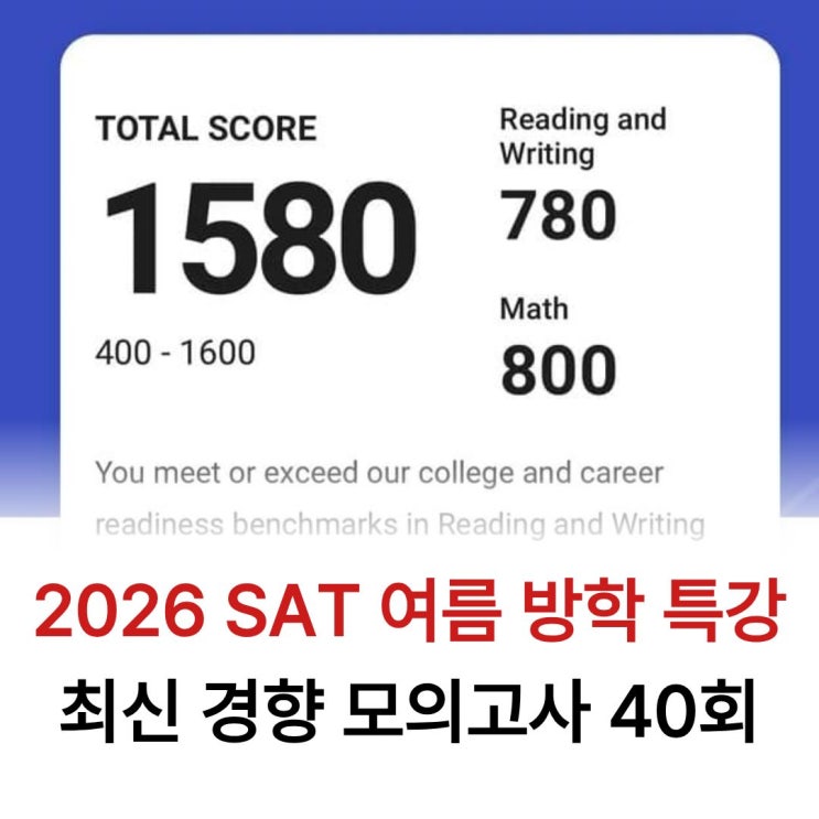 안녕하세요 김포 일산 유일의 디지털 SAT 전문 English PT 잉글리쉬 피티입니다. 학기 중에는 GPA 관리와 숙제를 하느라 정신이 없습니다 더군다나 AP 공부에 시험까지 보려면 학기 중에 SAT 공부는 현실적으로 불가능합니다 그렇기에 오직 여름 방학 3달 만이 SAT 공부를 할 수 있는 유일한 기간입니다. 이때 디지털 SAT의 1) 출제 방식 파악 2) 실제와 동일한 온라인 시험 환경 3) 모듈별 & 문제별 풀이 전략을 다르게 해야합니다. 잉글리쉬 피티 SAT 여름 특강, 이런 점이 다릅니다. 1. 2026년 최신 출제 경향 100% 반영 SAT는 해마다 출제패턴이 미세하게 변화하고 있습니다. 그렇기에 저희 잉글리쉬 피티도 그에 맞춰 2026년 최신 기출....... <img src="https://blogthumb.pstatic.net/MjAyNjA0MjlfMTEw/MDAxNzc3NDUzMTgyMzc4.qjOoNs_khaY2lOI3wFi6vXKxi7MiHRPmcwl1r-tfL7Ig.QGwW7_LbsSpzVa_scwh8uLH9wzQVM4bNAIFuPzW8GSIg.JPEG/%C0%CF%BB%EA_sat.jpg?type=s3" />