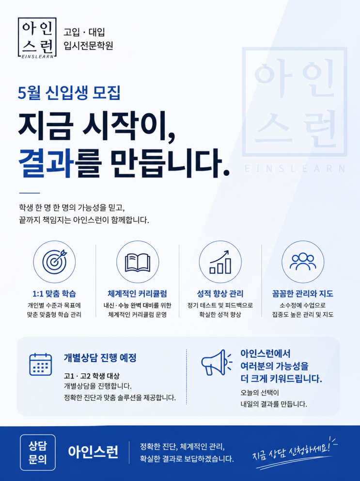 4월 중간고사 모두 정말 수고 많았습니다 시험 기간 동안 최선을 다해준 학생 여러분과 믿고 함께해 주신 학부모님들께 진심으로 감사드립니다. 학생들의 성실한 노력과 집중이 좋은 결과로 이어지고 있어 아인스런도 매우 기쁘게 생각합니다. 아인스런은 이번 중간고사 결과에 만족하지 않고, 앞으로 있을 기말고사에서도 더욱 좋은 성과를 낼 수 있도록 학생 개개인에게 맞춘 꼼꼼한 관리와 체계적인 지도로 최선을 다하겠습니다. 점수 및 등급 결과는 추후 안내드리겠습니다. 5월 신입생 모집이 진행 중입니다. 고1·고2 학생 대상 개별상담도 순차적으로 진행될 예정입니다. 앞으로도 학생들의 성장과 결과로 보답하는 아인스....... <img src="https://blogthumb.pstatic.net/MjAyNjA0MzBfMjMw/MDAxNzc3NTM2MTE2NzY5.6ev7CXq2bamhLDDHhftDBuJmoALyOX5hyDKo4rSXQGkg.017R2lEWRPL6W-KmP3p0rSDBjexHSpNOcXX-G3VKUS4g.PNG/%BE%C6%C0%CE%BD%BA%B7%B1_%C6%F7%BD%BA%C5%CD.png?type=s3" />