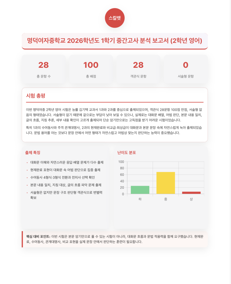 명덕여중 2학년 스콩이들, 이번 중간고사 어땠나요? 시험 보는 내내 얼마나 긴장됐을지, 밤새 공부하느라 힘들었을지 선생님들은 다 알고 있어요. 잘 본 것 같은 날도 있고, 아쉬운 날도 있었을 거예요. 이제 중요한 건 점수가 아니라 — 어디서 틀렸는지 아는 것! 그래서 스칼렛에서 이번 시험을 싹 다 분석해봤어요. 내가 왜 그 문제를 틀렸는지, 기말고사에서는 뭘 준비해야 하는지 아래에서 같이 확인해봐요. 이번 분석 보고서가 우리 스콩이들의 현재 위치를 파악하고 기말고사를 준비하는 데 도움이 되길 바래요 현재완료, 수여동사, 관계대명사 이번 시험에서 점수 차이를 만든 문법 포인트들은 기말고사에서도 반드시 다시 출제될 가....... <img src="https://blogthumb.pstatic.net/MjAyNjA0MjlfMTg2/MDAxNzc3NDU2NDYxODMy.C-2Htvy6bC4MIq_sMuWBxMCnCZTZlcTp7PoRakgHQdMg.QPr5OGKKuRZt4I46rLpJDSstslHVlzmUUVxJMn5cjDUg.PNG/image.png?type=s3" />