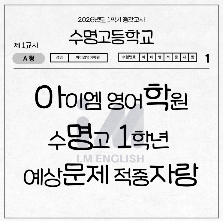 2026학년도 1학기 수명고1 중간고사 영어, 실제 적중 결과 공개 안녕하세요. 아이엠영어학원입니다. 중간고사가 끝난 뒤 가장 많이 듣는 질문 중 하나는 “학원에서 준비한 내용이 실제 시험에 얼마나 도움이 되었나요?” 입니다. 이번 2026학년도 1학기 수명고1 영어 중간고사에서는 아이엠영어학원의 내신 대비 자료와 변형 문제, 서술형 대비 자료가 실제 시험에서 높은 적중률을 보이며 학생들이 보다 안정적으로 시험에 접근할 수 있도록 도왔습니다. 단순히 “비슷한 문제를 풀었다” 수준이 아니라, 지문 유형, 선지 구성, 핵심 키워드, 빈칸 위치, 서술형 답안 포인트까지 실제 시험과 매우 높은 유사도를 보였습니다. 1. 수명고 14번 –....... <img src="https://blogthumb.pstatic.net/MjAyNjA0MzBfMjAw/MDAxNzc3NTMwODE4NTkz.HNLhxMQbdhaP_oFBQixk5myJeRtgE_oPq770sZXHzd4g.ZQOKFXK7TAf2UQoRzKVARu7dfvTdk5anyiRu1XpzHpQg.PNG/1.png?type=s3" />