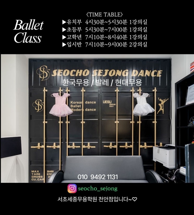 "서초세종무용학원" 서울서초지점을 시작으로 천안성성지점에 자리합니다 ☎ 010 9492 1131 ☎ seocho_sejong 안녕하세요~♡ 서초세종무용학원 천안점입니다~♡ 방문해주셔서감사합니다~♡ 무용 전공으로 고민하는 학생과 학부모님을 위한" 진로 진학 컨설팅" 상담받습니다 전화 상담 :⠀010 9492 1131 카카오톡 : 서초세종무용학원 블로그 : blog.naver.ancecom›sejongd 오시는 길: 서울점 서초구 방배동 478-7 2층 오시는 길: 천안점 성성10길3 성성초등학교앞 1층 ▶입시상담▶예약 후▶방문상담 서초세종무용학원 서울점이나 천안점 편하신 곳으로 방문 상담합니다. ....... <img src="https://blogthumb.pstatic.net/MjAyNjA0MjNfMjQ2/MDAxNzc2OTQ5NDQ2Nzk4.mwcgOOu8iBeidOw4MMLrvjfpKUuj36i0llaS4lsZMHsg.7q8h3YGn6OO-w-ysJ2-BrFy5saJ4JsMWcM7tTNkKVJAg.JPEG/TIME_TABLE.jpg?type=s3" />