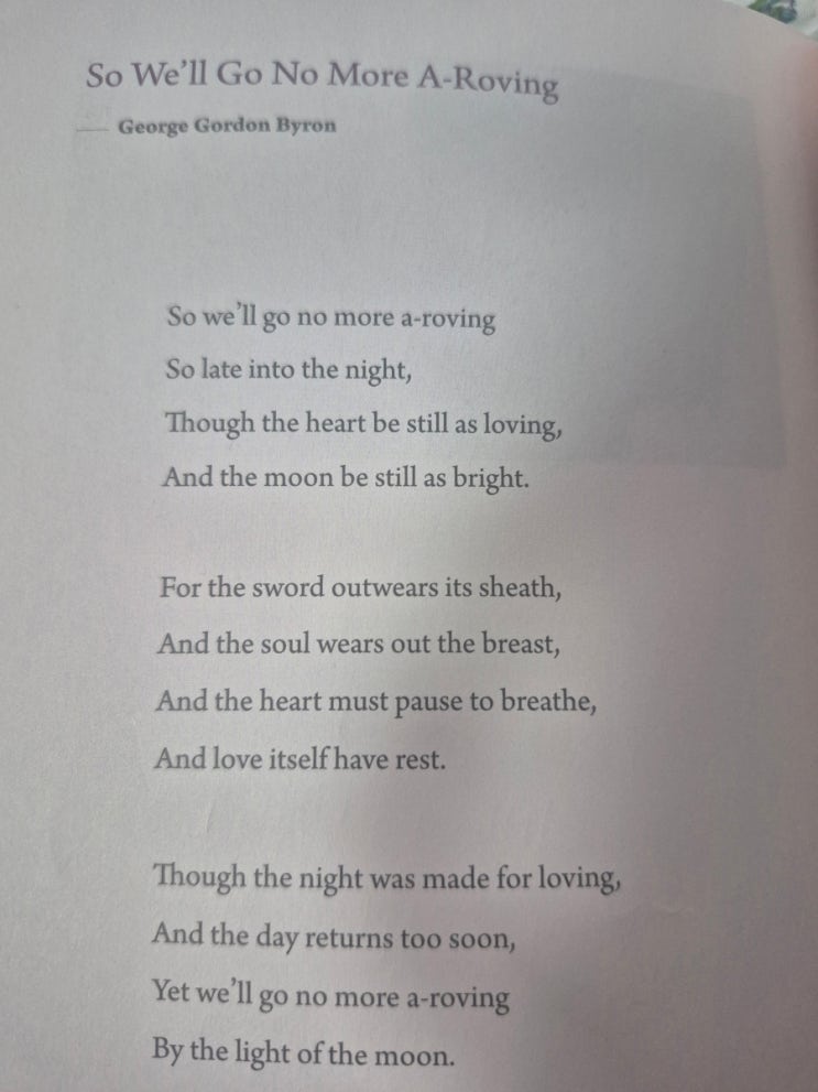 이제 우리 더 이상 방황하지 않으리 -조지 고든 바이런- 이제 우리 더 이상 방황하지 않으리 we'll go now more a rovoing 이토록 늦은 한밤중에 so late into the night 마음은 여전히 사랑에 불타고 though the heart be still as loving, 달빛 여전히 빛나지만 And the moon be still as bright 칼을 쓰면 칼집이 해어지고 for the sword our wears it's sneath, 영혼이 괴로우면 마음이 허나니 and the soul wears out the breastfeeding. 심장도 숨 쉬려면 쉬어야 하고 and the heart must puse to breath 사랑에도 휴식이 있어야 하느니 and love itself have rest 밤은 사랑을 위해 있고 though the night was made for loving ....... <img src="https://blogthumb.pstatic.net/MjAyNjA0MjNfMjQ3/MDAxNzc2OTA0MDcxOTM0.5t84f6E_V-M2aRgJEx7LokkVaG7kksjYazxSVJlyLnEg.gyQMfvvBC0zh31GH9uKUi5P8U6b7KfwvwVX9fHTGkEAg.JPEG/900_20260423_083327.jpg?type=s3" />