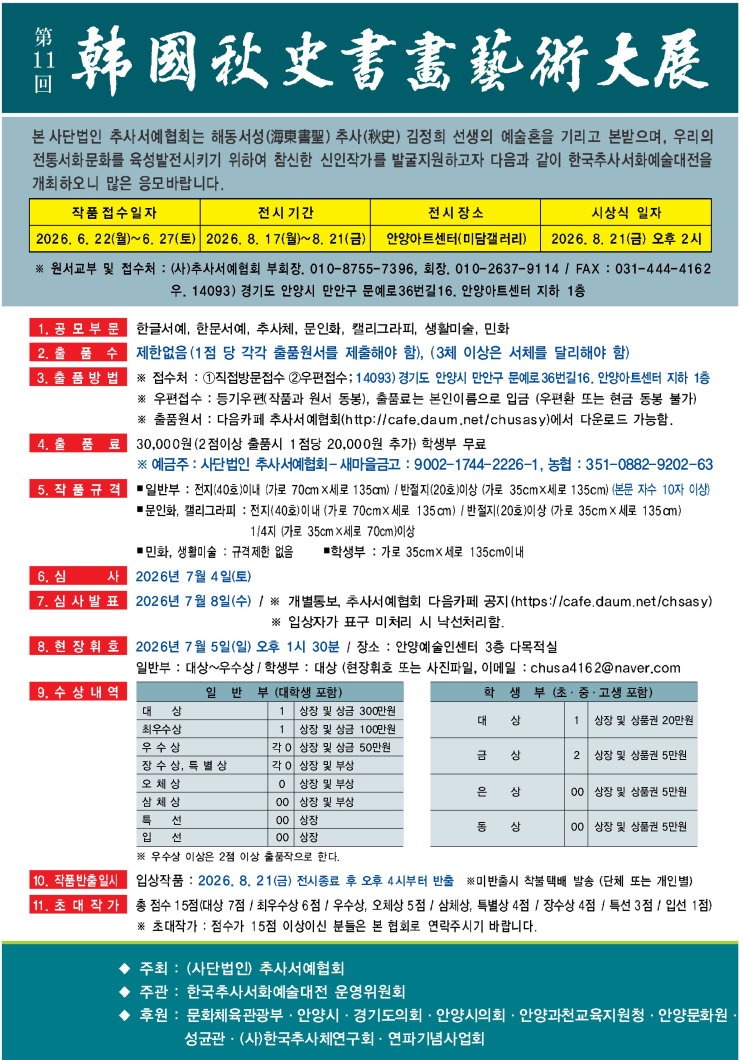 추사서예협회 | 제11회 한국추사서화예술대전 출품 요강 및 원서 - Daum 카페 <img src="https://blogthumb.pstatic.net/MjAyNjA0MjZfMTQz/MDAxNzc3MjE1MjUyMTg4.kBlCIZIED2yxjeAzlz3VrB3DoguHenp7vdrezZ3yJy0g.hivWwzMdTyLTkSgnp7AAuK4oZS9QPorKMTBbS7rQi-cg.PNG/image01.png?type=s3" />
