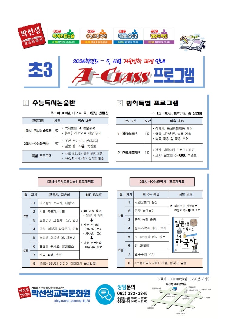 광주국어학원 동명동학원 박선생국어학원 2026 - 5, 6월 초3 [독서토론논술&한국사] 프로그램 안내 저자 직강 전문 원장 시스템, 테스트 후 수준별 반편성함. 주 1회, 100분, 6~8명 그룹반, 주중 1:1 클리닉반으로 운영함. #고등국어, #수능국어, #내신수능, #수능내신, #수능대비, #수능대비국어, #내신국어, #독서토론논술, #독서논술, #대입논술, #입시논술, #동명동국어, #광주국어학원 <img src="https://blogthumb.pstatic.net/MjAyNjA0MjVfMTk4/MDAxNzc3MTAwNjE0Njc1.345Wr7wJoS-XbFz72BcDbTh6N397Vg30wx5-s2P-2Okg.JSP-F_uUnTSVsGuFLOO8qsi0vGMk5wl5ZP5ZVujD_3Mg.JPEG/2026-5%2C6%BF%F9%C3%CA3%C7%C1%B7%CE%B1%D7%B7%A502001.jpg?type=s3" />