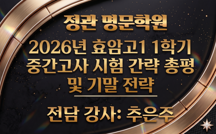 안녕하십니까, 명문학원 강사 추은주 입니다. 효암고1 학생 여러분, 중간고사 치르느라 정말 고생 많았습니다. 이번 시험은 단순한 본문 암기 수준을 넘어, 수능에서 요구하는 논리적 사고력까지 묻는 상당히 완성도 높은 시험이었습니다. 전체적인 출제 경향을 분석한 내용을 바탕으로 난이도 총평과 다가올 기말고사 대비 전략을 정리해 드립니다. 1. 난이도 총평 : 탄탄한 기본기를 묻는 고난도 시험 (전체 체감 난이도 '상') 지문의 추상성: 3월 모의고사 지문들(인내, 패러다임, 좋은 조상 등)이 다소 철학적이고 개념적인 주제를 다루고 있어, 단순 해석에만 의존했다면 정답을 추론하기 까다로웠을 것입니다. 서술형의 정교함: ....... <img src="https://blogthumb.pstatic.net/MjAyNjA0MjZfMjMz/MDAxNzc3MjAxNzM3MzY2.jA_wF6-p7C4nnl5huz95VeiWmdNsz1ew--hN7wuY94Eg.PrwWJ6cYgjlXzUub9Vg8GzQ1OZg99mxQBYlUzUNzvC0g.PNG/Gemini_Generated_Image_5btmbx5btmbx5btm.png?type=s3" />